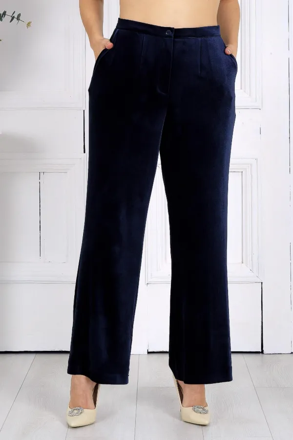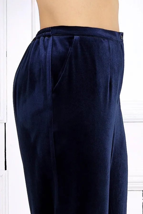 Брюки классические длинные, прямого силуэта, с посадкой на талии, выполнены из трикотажного полотна «велюр». Модель с центральной застёжкой на тесьму-«молнию», на притачном поясе, застегивающемся на петлю и пуговицу. Передние и задние половинки брюк с талиевыми вытачками, направленными от пояса вниз. Спереди обработаны боковые наклонные карманы. Для лучшего прилегания брюк в области талии в поясе по задним половинкам вставлена эластичная лента. Длина брюк по боковому (с поясом)-107 см (52-54 р-р), 108 см (56-60 р-р).