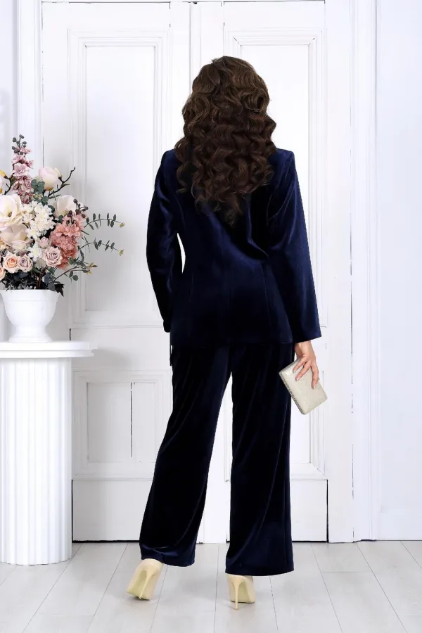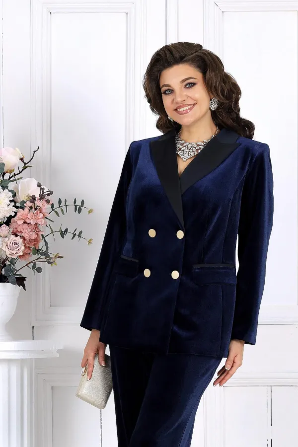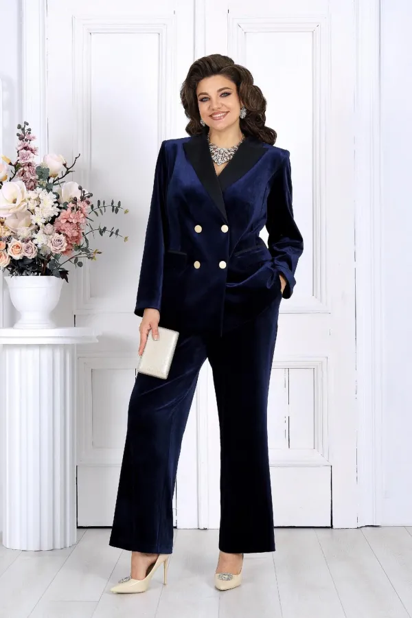 Этот костюм — воплощение классики вечерней моды и станет незаменимым вариантом для женщин, которые ищут стильный и одновременно комфортный наряд на торжество. Воротник и лацканы из сатина придают изделию утонченный и благородный вид, что делает его подходящим для новогоднего корпоратива, свадьбы или юбилея. Высококачественные материалы и продуманное лекало обеспечивают не только привлекательный внешний вид, но и максимальный комфорт. Такой костюм идеально подойдет для полных женщин, которые ценят элегантность и удобство.