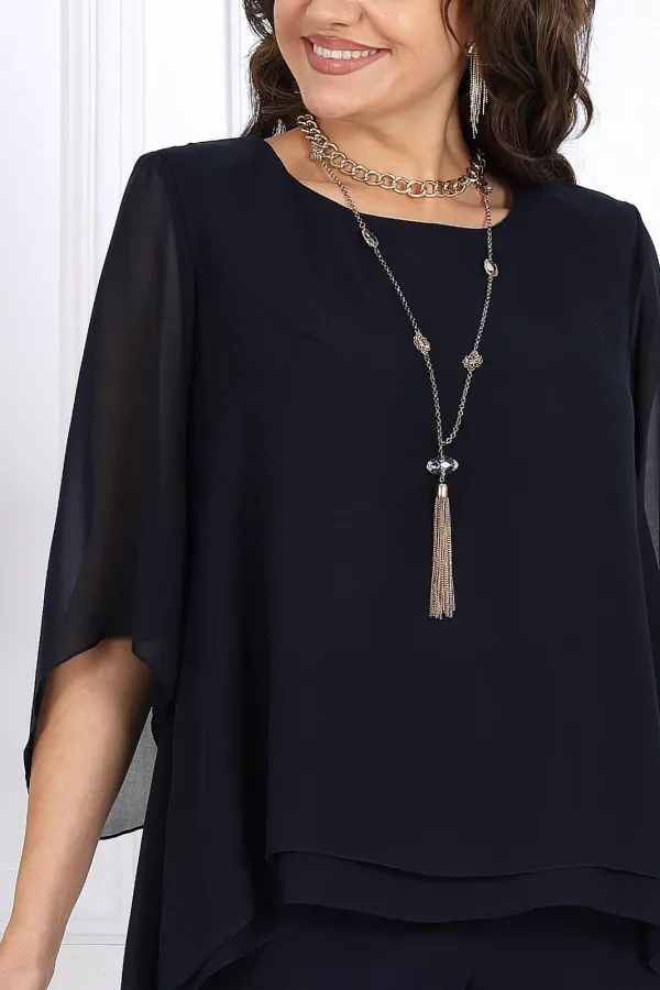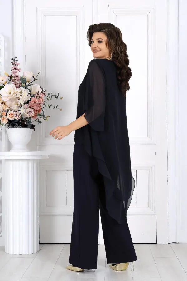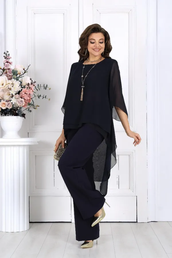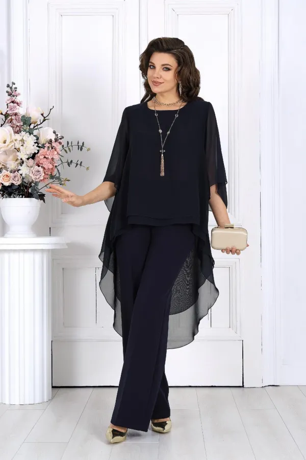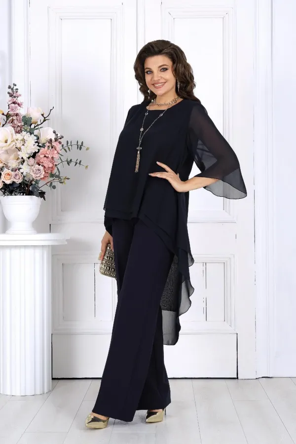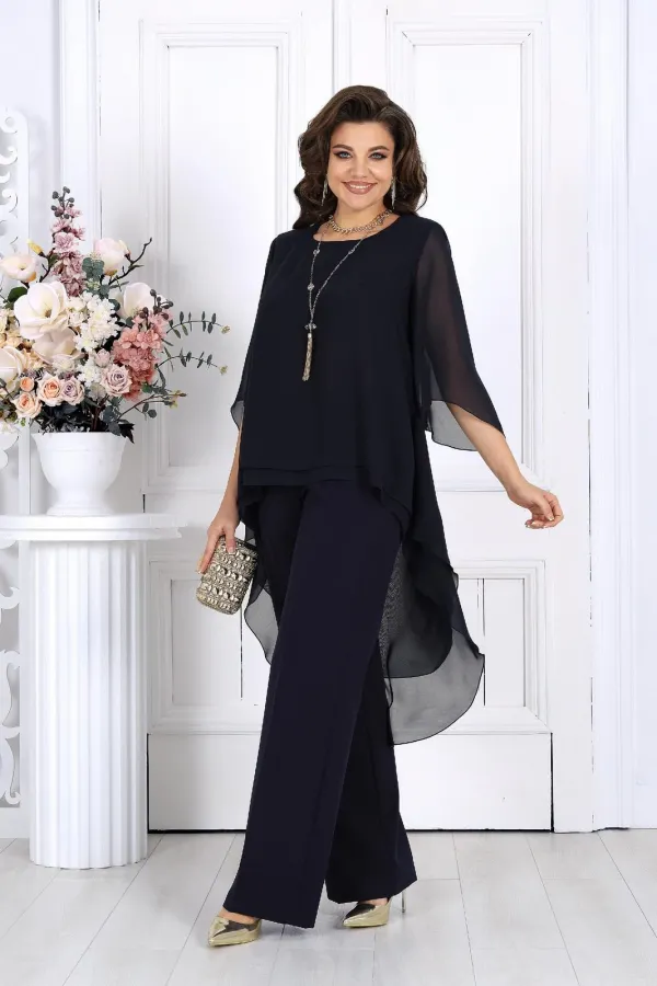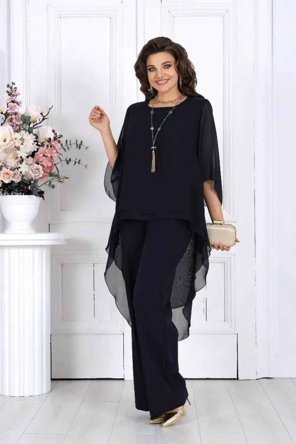Элегантный брючный костюм – идеальный выбор для вечернего выхода, торжества или особого случая. Легкая шифоновая туника с асимметричным кроем и струящимися рукавами добавляет образу воздушности и утонченности. Удлиненная спинка делает силуэт элегантным и зрительно вытягивает фигуру. Прямые классические брюки из костюмной ткани великолепно садятся по