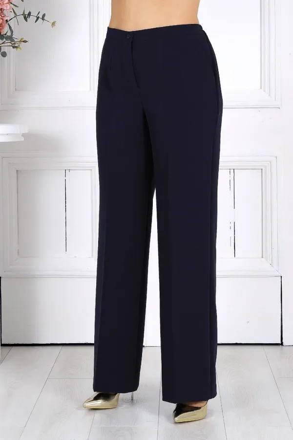 Брюки классические длинные, прямого силуэта, с посадкой на талии, выполнены из костюмно-плательного ткани. Модель с центральной застёжкой на тесьму-«молнию», на притачном поясе, застегивающемся на петлю и пуговицу. Передние и задние половинки брюк с талиевыми вытачками, направленными от пояса вниз. Спереди обработаны боковые наклонные карманы. Для лучшего прилегания брюк в области талии в поясе, по задним половинкам вставлена эластичная лента. Длина брюк по боковому (с поясом) – 107 см (46-50 р-р.), 108 см (52-54 р-р), 109 см (56-60 р-р).