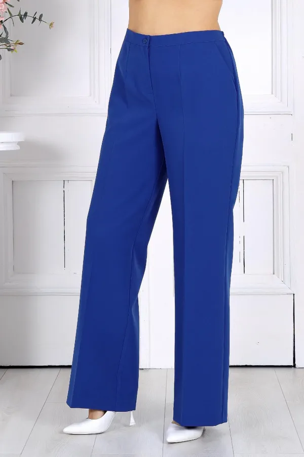 Брюки классические длинные, прямого силуэта, с посадкой на талии, выполнены из костюмно-плательного ткани. Модель с центральной застёжкой на тесьму-«молнию», на притачном поясе, застегивающемся на петлю и пуговицу. Передние и задние половинки брюк с талиевыми вытачками, направленными от пояса вниз. Спереди обработаны боковые наклонные карманы. Для лучшего прилегания брюк в области талии в поясе, по задним половинкам вставлена эластичная лента. Длина брюк по боковому (с поясом) – 107 см (46-50 р-р.), 108 см (52-54 р-р), 109 см (56-60 р-р).