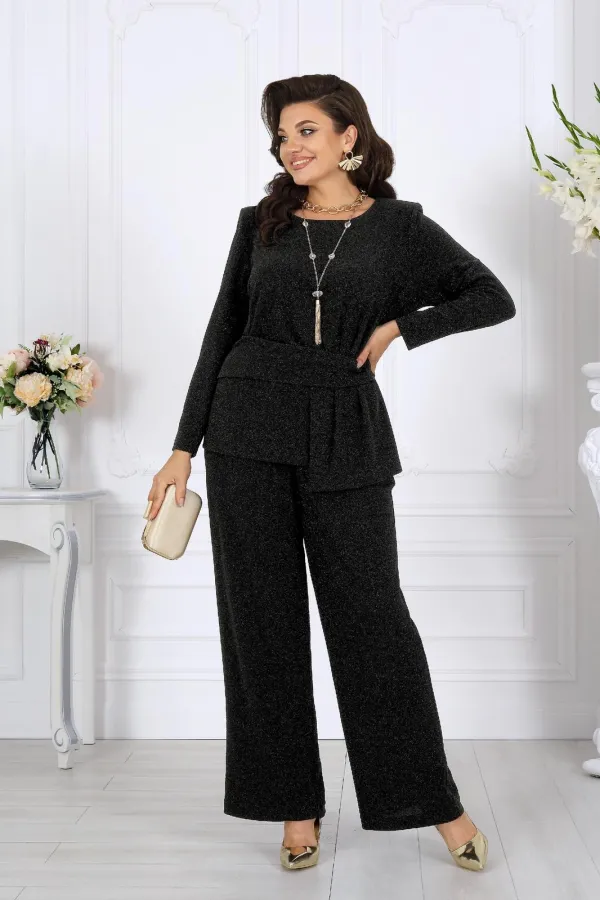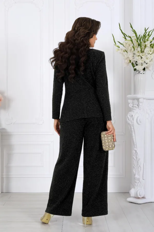 В этом костюме каждая деталь продумана так, чтобы создавать ощущение безупречного стиля и лёгкой роскоши. Мягкое мерцание люрекса делает образ выразительным и дорогим, а утончённый крой подчёркивает женственность и гармонию силуэта.