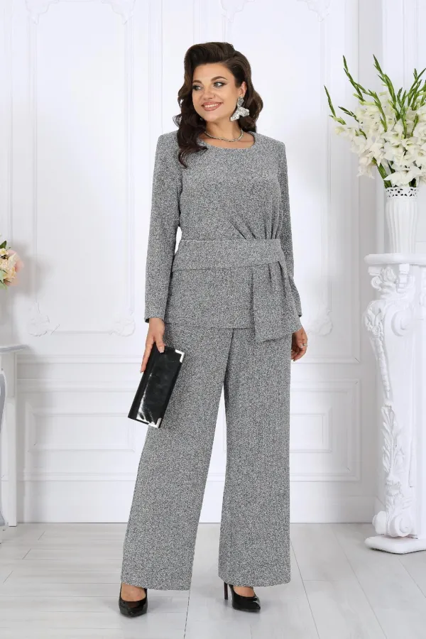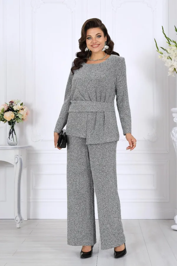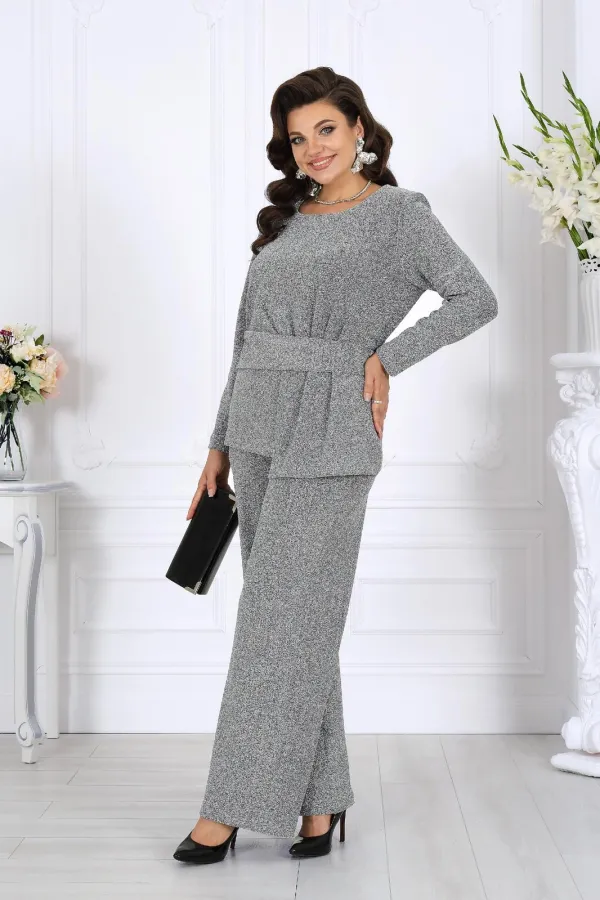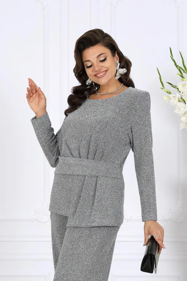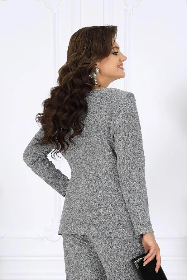 В этом костюме каждая деталь продумана так, чтобы создавать ощущение безупречного стиля и лёгкой роскоши. Мягкое мерцание люрекса делает образ выразительным и дорогим, а утончённый крой подчёркивает женственность и гармонию силуэта.