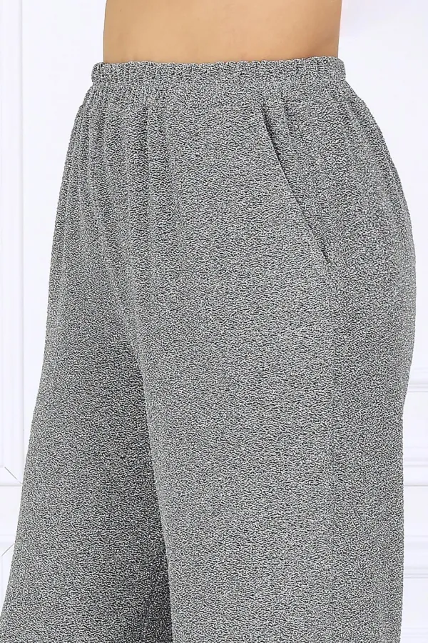 Брюки длинные, с посадкой на талии, выполнены из трикотажного полотна с фактурной лицевой стороной «люрекс». Модель без стрелок, без застежки. Спереди обработаны наклонные боковые карманы. Для лучшего прилегания по линии талии в притачном поясе предусмотрена эластичная лента, вставленная по всей длине. Длина брюк по боковому (с поясом) – 106 см (50-52 р-р), 107 см (54-58 р-р).