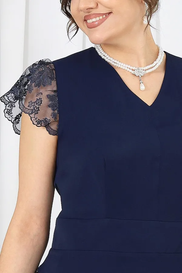 Туника полуприлегающего силуэта, выполнена из костюмно-плательной ткани. Модель без подкладки, в левом боковом потайная молния. По спинке горловина округлой формы, а по переду V – образная, обработана обтачкой. Туника отрезная по линии талии. Лиф туники и нижняя часть соединены по талии притачным поясом. На полочке и спинке обработаны талиевые вытачки. Боковые швы блузы ассиметричны, правый боковой фигурной формы и в качестве отделки по краю среза использовано кружево. Рукава «крылышки» из кружева. Длина туники (спинка) – 138 см (50-58 р-р).