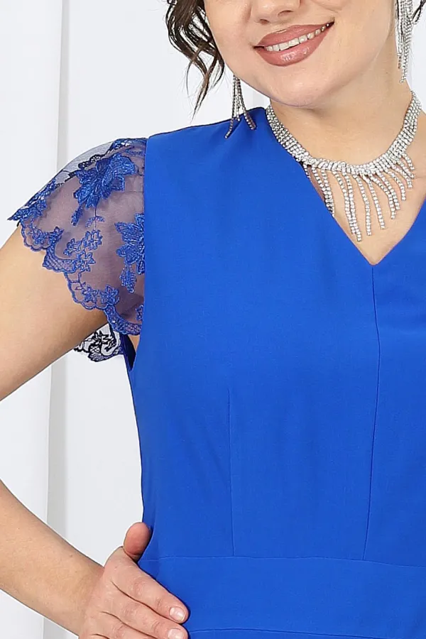 Туника полуприлегающего силуэта, выполнена из костюмно-плательной ткани. Модель без подкладки, в левом боковом потайная молния. По спинке горловина округлой формы, а по переду V – образная, обработана обтачкой. Туника отрезная по линии талии. Лиф туники и нижняя часть соединены по талии притачным поясом. На полочке и спинке обработаны талиевые вытачки. Боковые швы блузы ассиметричны, правый боковой фигурной формы и в качестве отделки по краю среза использовано кружево. Рукава «крылышки» из кружева. Длина туники (спинка) – 138 см (50-58 р-р).