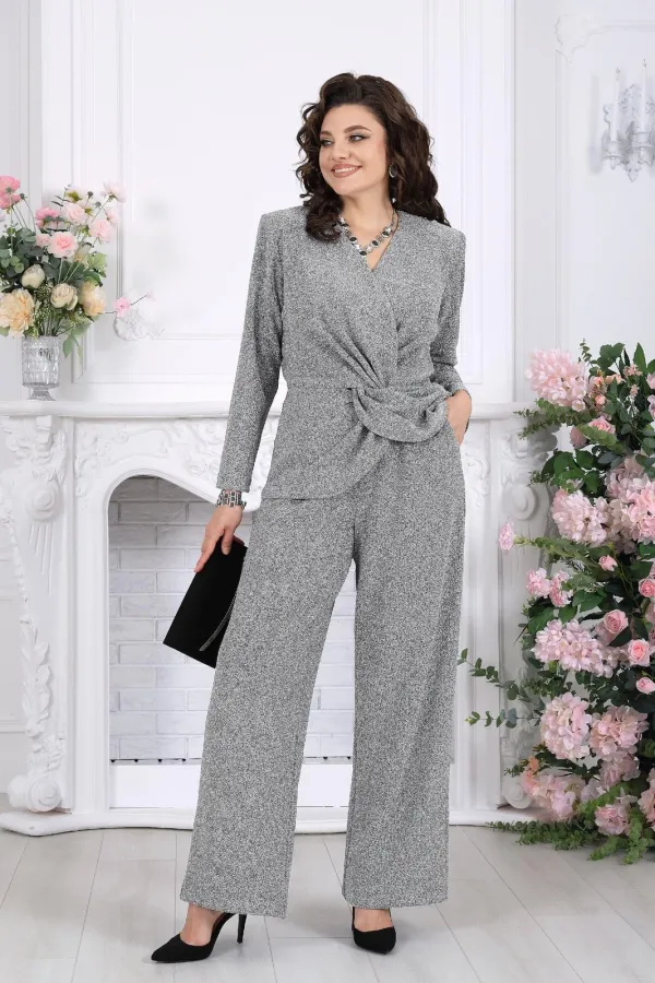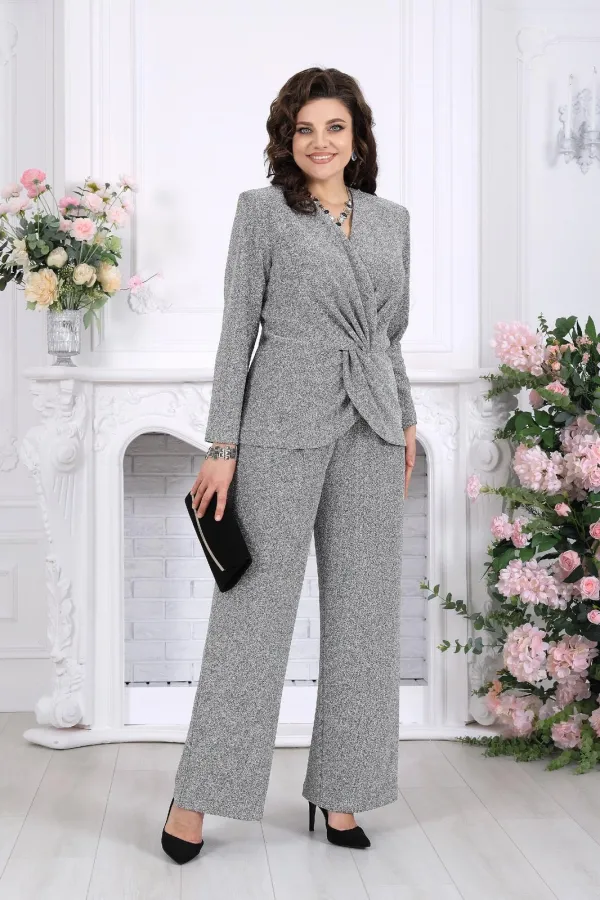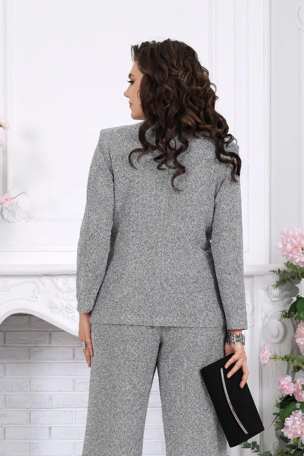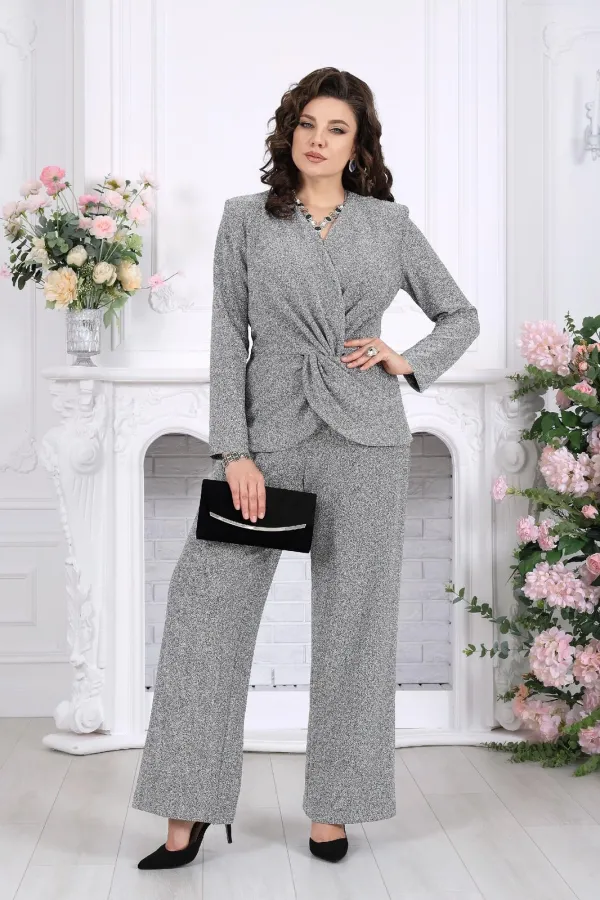 Этот костюм словно создан для моментов, когда хочется выглядеть особенно — уверенно, элегантно и чуть сияюще. Лаконичный силуэт, мягкий блеск люрекса и продуманная посадка делают образ выразительным без перегрузки.