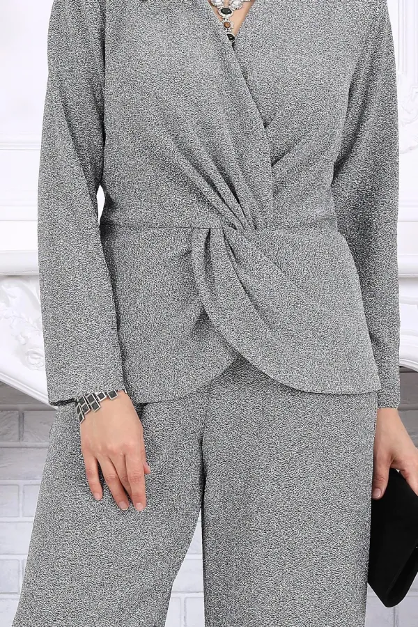 Блузка полуприлегающего силуэта, выполнена из трикотажного полотна с фактурной лицевой стороной «люрекс». Модель на трикотажной подкладке, с длинным втачным рукавом и плечевыми накладками. Спинка с талиевыми вытачками и средним швом. Перед блузы с имитацией «запаха», отрезной по линии талии, по центру декорирован драпировкой «перекрут». Внизу полочки округлой формы. Горловина округлая по спине, V – образная спереди. Длина блузки – 64 см (50-58 р-р); длина рукава – 59 см (50-58 р-р)