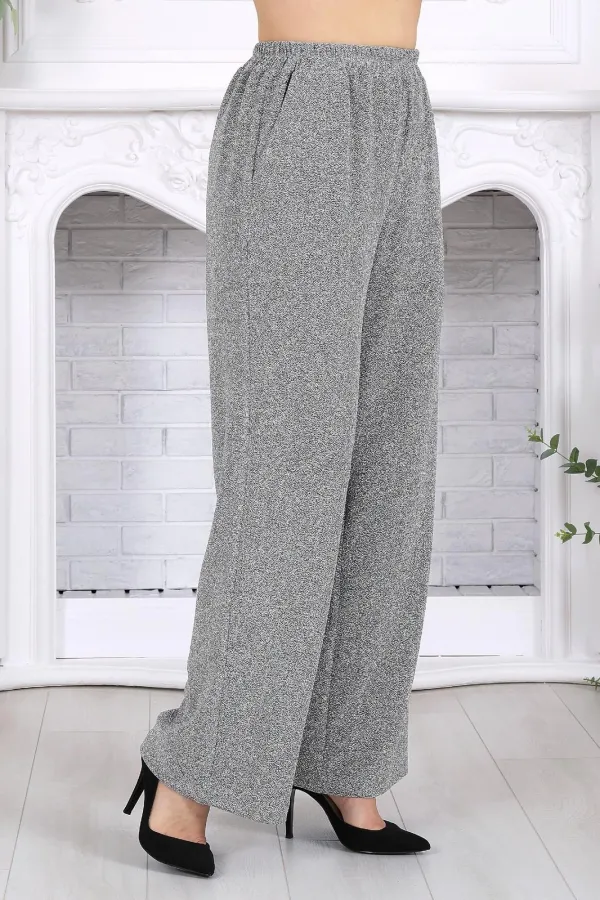 Брюки длинные, с посадкой на талии, выполнены из трикотажного полотна с фактурной лицевой стороной «люрекс». Модель без стрелок, без застежки. Спереди обработаны наклонные боковые карманы. Для лучшего прилегания по линии талии в притачном поясе предусмотрена широкая эластичная лента, вставленная по всей длине. Длина брюк по боковому (с поясом) –107 см (50-52 р-р), 108 см (54-58 р-р).