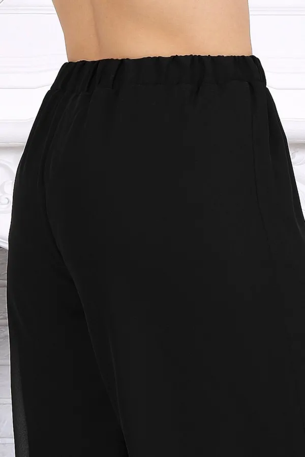Брюки широкие выполнены из ткани шифон на трикотажной подкладке по всей длине. Модель без стрелок и без застежки. Спереди обработаны наклонные боковые карманы. Для лучшего прилегания по линии талии в притачном поясе предусмотрена эластичная лента, вставленная по всей длине пояса.