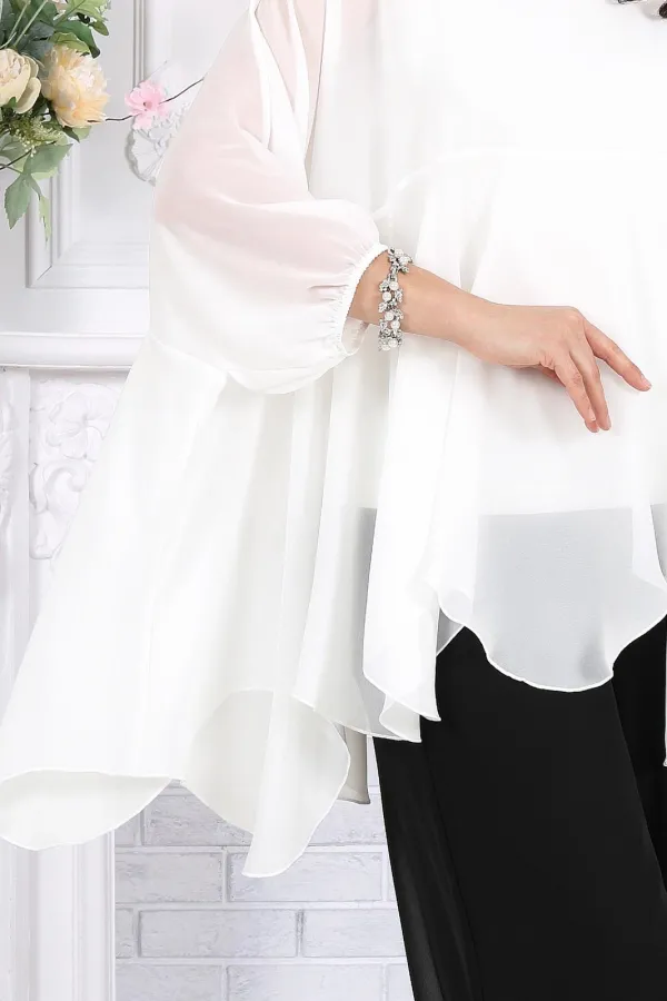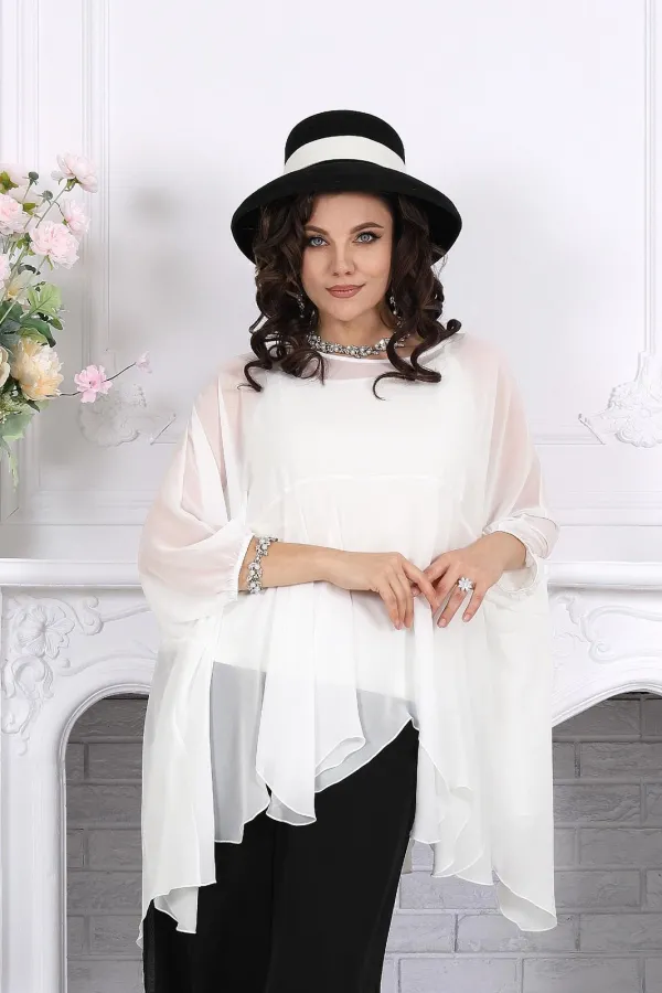Полупрозрачная туника словно окутывает силуэт легкой вуалью, добавляя образу загадочности и утонченности. Внутренний топ формирует аккуратную основу, а струящиеся брюки завершают ансамбль, создавая вытянутый, элегантный силуэт.