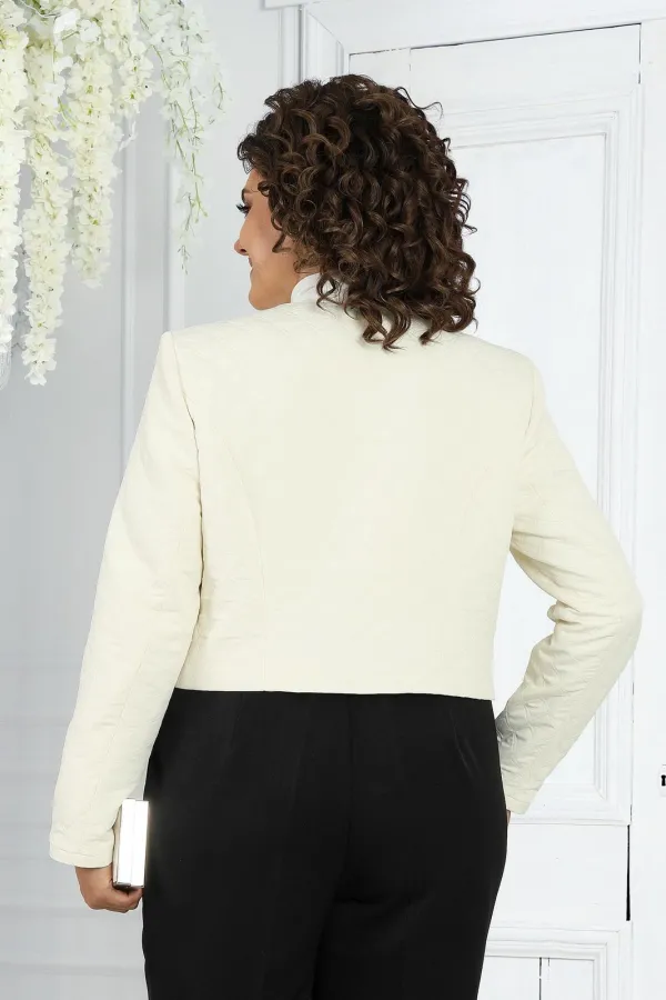 Жакет полуприлегающего силуэта, длиной по центру спинки 45 см, с центральной бортовой застежкой на 3 петли и пуговицы. Перед с рельефными швами, идущими от пройм до низа, проходящими через центр груди. Правая половинка переда с притачной планкой по борту шириной 3 см. По переду жакета, в верхней и в нижней части расположены настрочные клапаны, в верхний срез которых вставлена декоративная тесьма с жемчугом. Спинка с рельефами от пройм до низа. Горловина переда и спинки круглой формы, по переду углубленная. Рукава втачные, двухшовные. Длина рукава 62 см. Жакет на подкладке, с плечевыми накладками.