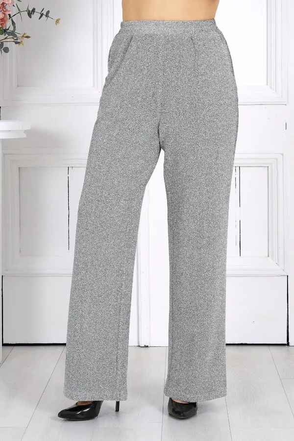 Брюки классические длинные, прямого силуэта, с посадкой на талии, выполнены из трикотажного полотна с фактурной лицевой стороной «люрекс». Модель без застёжки, на притачном поясе, с эластичной лентой внутри.