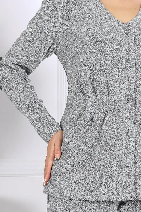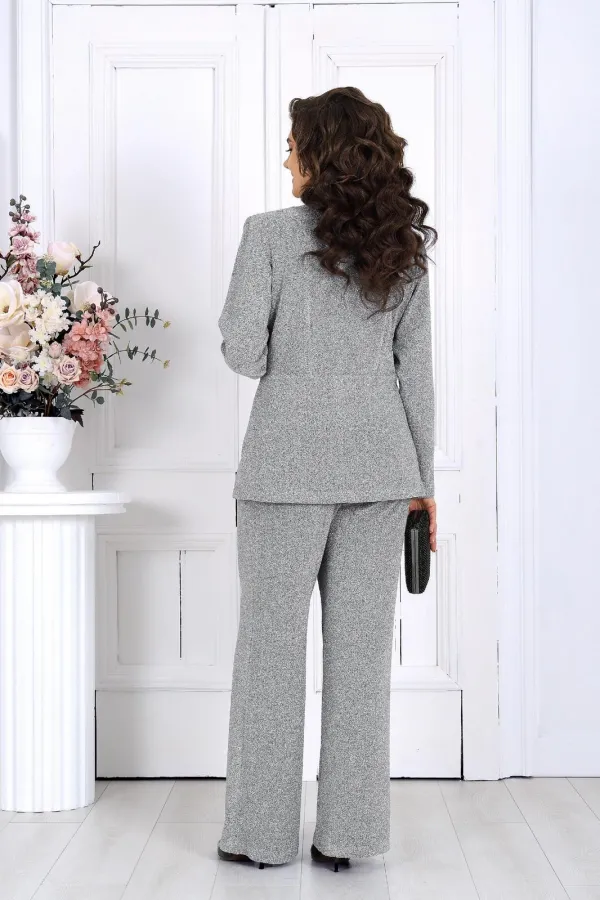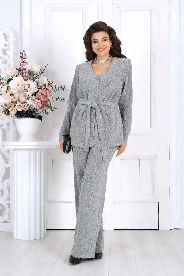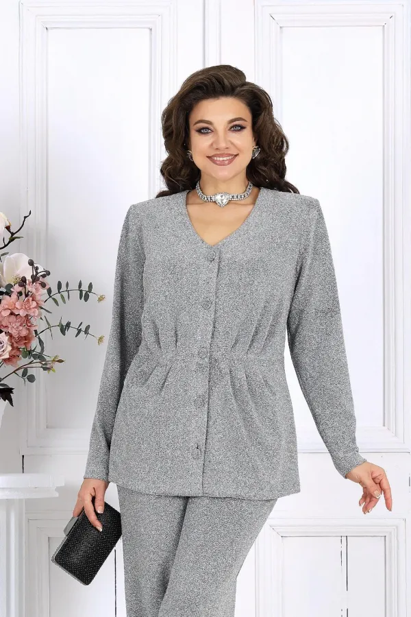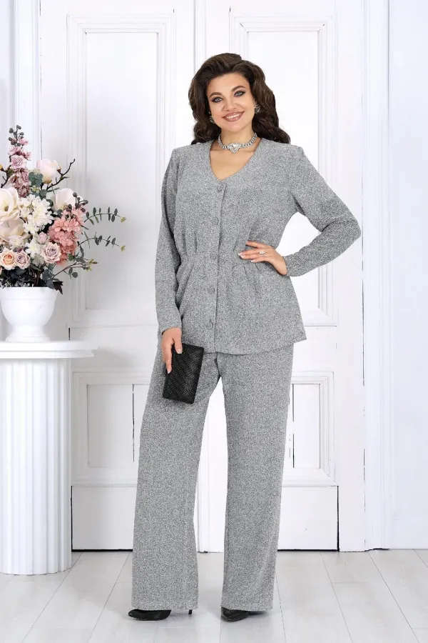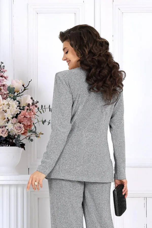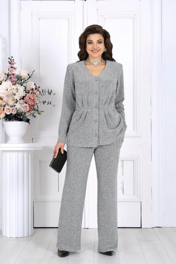 Элегантный брючный комплект – идеальный выбор для праздника, вечера в ресторане или важного мероприятия. Жакет с выразительным V-образным вырезом и аккуратными складками по линии талии подчёркивает женственный силуэт, а сияющая ткань с люрексом придаёт образу динамику и мягкость, создавая гармоничное сочетание классики и современности.