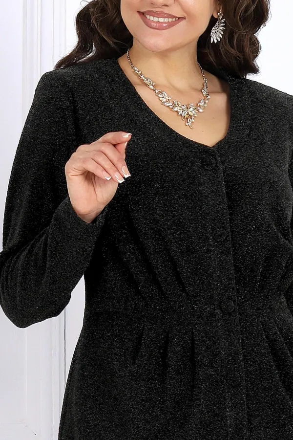 Жакет отрезной по линии талии, выполнен из трикотажного полотна с фактурной лицевой стороной «люрекс». Модель на подкладке, с плечевыми накладками; без воротника, с V-образным вырезом горловины. В верхней части переда заложены 3 односторонние складки, направленные от талии к центру груди, и 3 односторонние складки на баске, направленные к низу. На спинке обработаны талиевые вытачки. Борта и горловина оформлены отрезной планкой. Жакет с однобортной застежкой на 5 прорезных петель и 5 пуговиц, обтянутые основным материалом. Рукав длинный, втачной. Длина жакета – 68 см; длина рукава – 61 см.