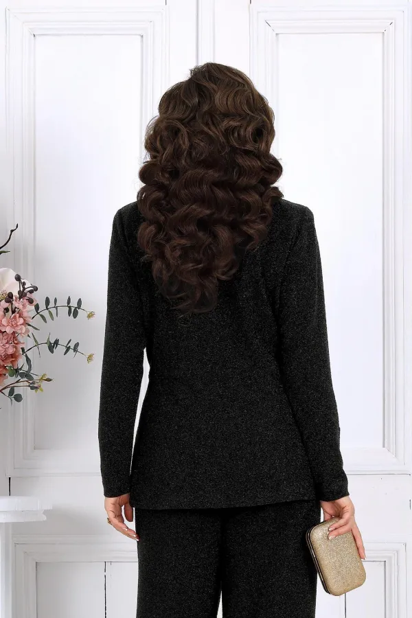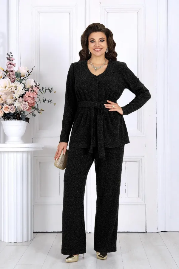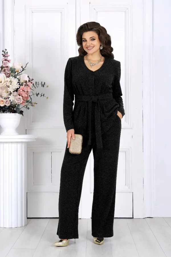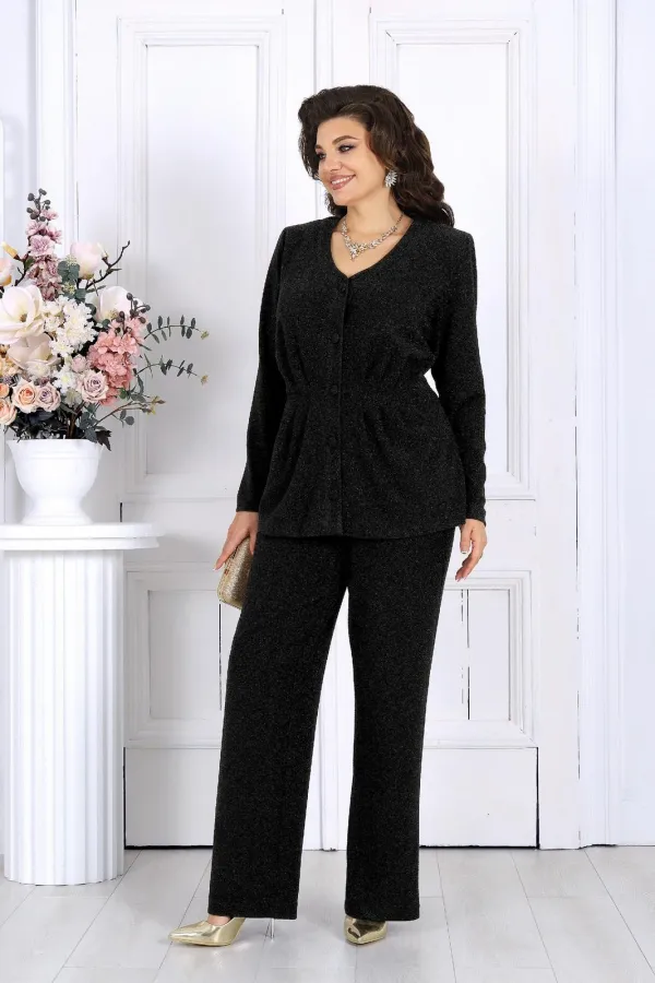 Элегантный брючный комплект – идеальный выбор для праздника, вечера в ресторане или важного мероприятия. Жакет с выразительным V-образным вырезом и аккуратными складками по линии талии подчёркивает женственный силуэт, а сияющая ткань с люрексом придаёт образу динамику и мягкость, создавая гармоничное сочетание классики и современности.