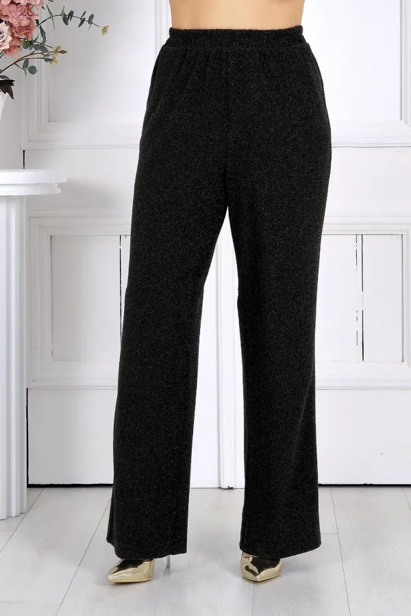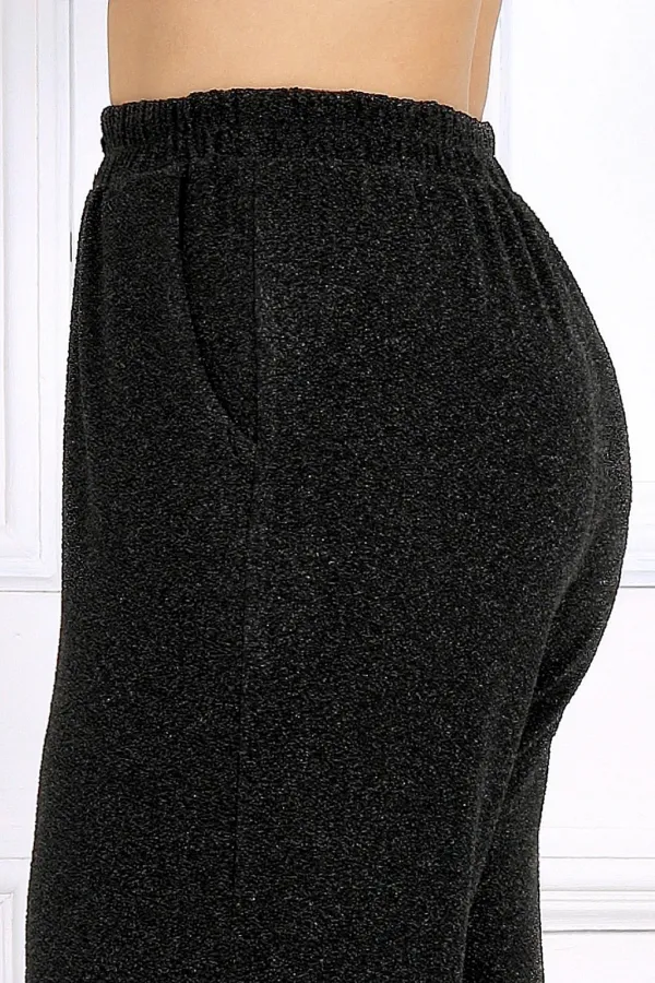 Брюки классические длинные, прямого силуэта, с посадкой на талии, выполнены из трикотажного полотна с фактурной лицевой стороной «люрекс». Модель без застёжки, на притачном поясе, с эластичной лентой внутри.