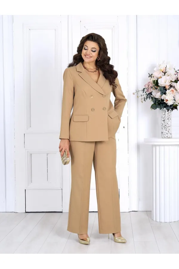 Этот брючный костюм — отличное решение для создания офисного, делового или вечернего образа. Он сочетает в себе классические элементы и новое прочтение классики. Носите его «и в пир, и в мир» — для работы, праздников или важных событий. Жакет двубортного кроя с классическим пиджачным воротником подчеркивает строгость и утонченность образа. Шлица на спинке с пуговицами придает модели динамичности и оригинальности.