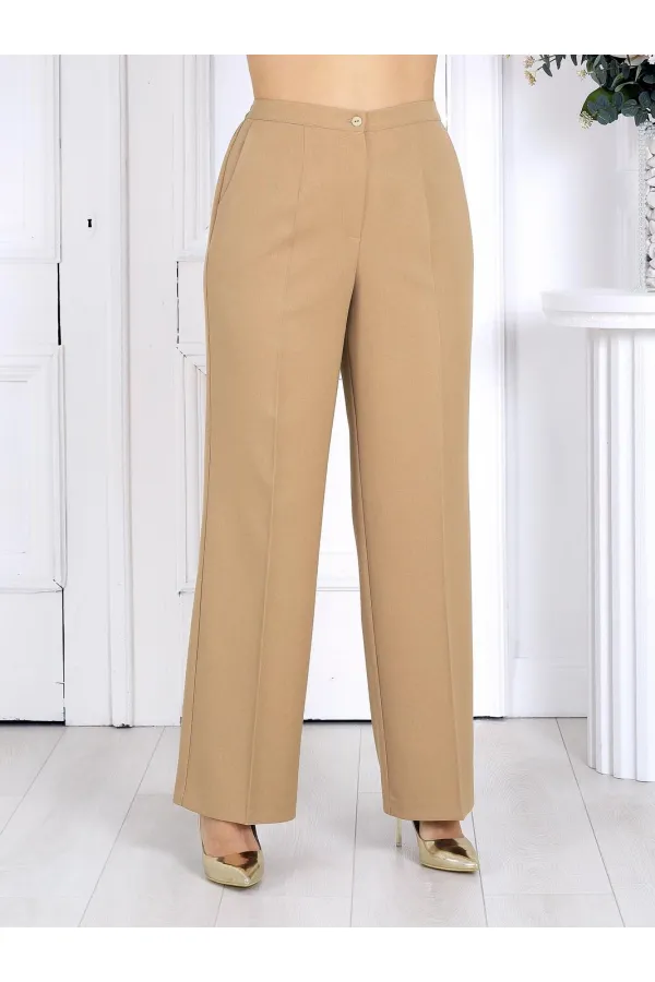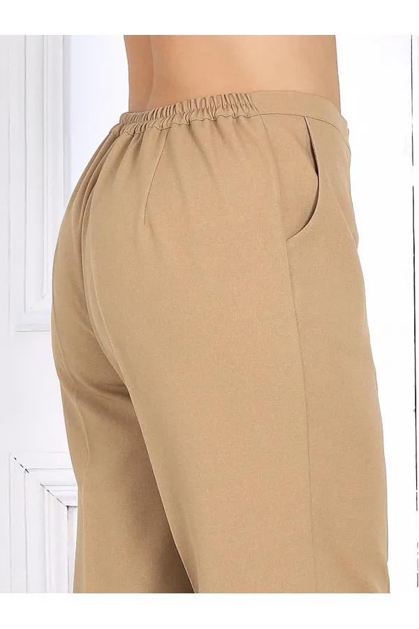Брюки классические, с кантами и посадкой на талии, выполнены из костюмной поливискозы. Модель с центральной застёжкой на тесьму-«молнию», на притачном поясе, застегивающемся на петлю и пуговицу. Передние и задние половинки брюк с талиевыми вытачками, направленными от пояса вниз. Спереди обработаны боковые наклонные карманы. Для лучшего прилегания брюк в области талии в поясе по задним половинкам вставлена эластичная лента. Длина брюк по боковому (с поясом)-106 см (50-54 р-р), 107 см (56-58 р-р).