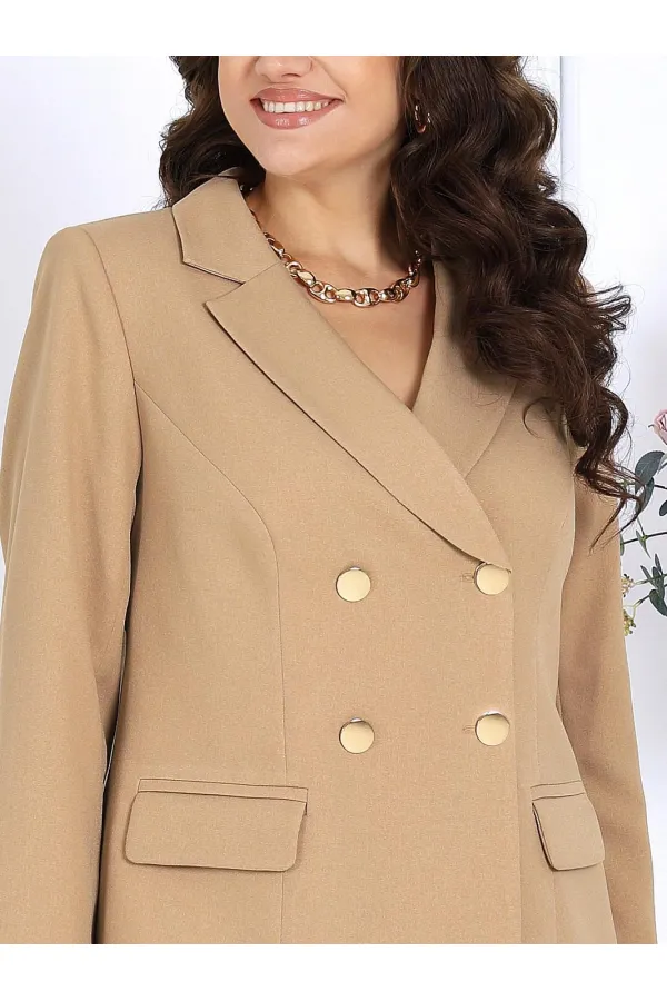 Жакет классический на подкладке, полуприлегающего силуэта, выполнен из костюмной поливискозы. Спереди обработаны рельефные швы, направленные от пройм до низа; в нижней части переда расположены прорезные карманы с клапаном. Перед с двубортной внешней застежкой на 2 декоративные пуговицы и внутренней на 2 потайные. На спинке обработана высокая шлица с застежкой на 3 декоративные пуговицы. Воротник пиджачного типа. Рукав длинный, втачной; в нижней части локтевого шва – имитация шлицы с застежкой на 3 пуговицы. Длина жакета - 66 см; длина рукава - 61 см.