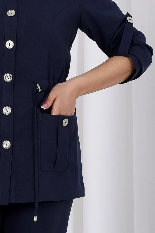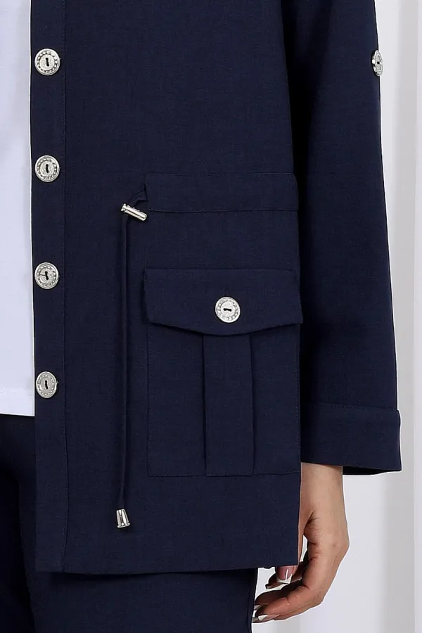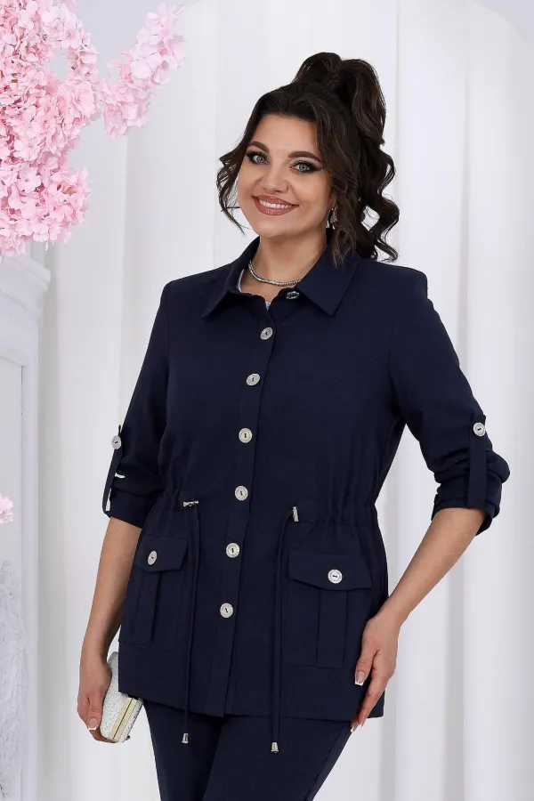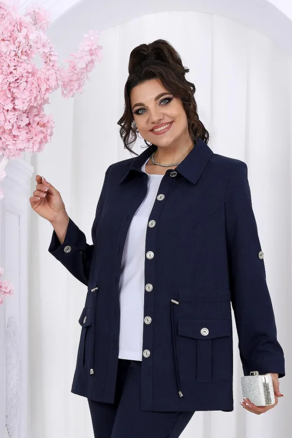 Жакет прямого силуэта, выполнен из ткани «лен-вишер». Модель без подкладки, с плечевыми накладками и однобортной внешней застежкой с отрезными планками на 7 петель и 7 пуговиц. Перед с нагрудными вытачками, выходящими из пройм. В нижней части переда настрочены накладные карманы с бантовой складкой посередине кармана и клапаны, застегивающиеся на 1 петлю и 1 пуговицу. По спинке и частично по переду настрочена кулиса, в которую втянут поясок из основной ткани. Для регулировки сборки по кулисе предусмотрены фиксаторы, концы пояса оформлены наконечниками. Горловина округлой формы со стояче-отложным воротником на отрезной стойке. Рукав втачной, длинный, с притачной манжетой, застегивающейся на 1 петлю и 1 пуговицу; по середине рукава настрочена пата, застегивающаяся на 1 петлю и 1 пуговицу, что позволяет регулировать длину рукава. Длина жакета - 71 см (46-50 р-р), 72 см (52-60 р-р), 73 см (62-66 р-р). Длина рукава (с манжетой) - 61 см.