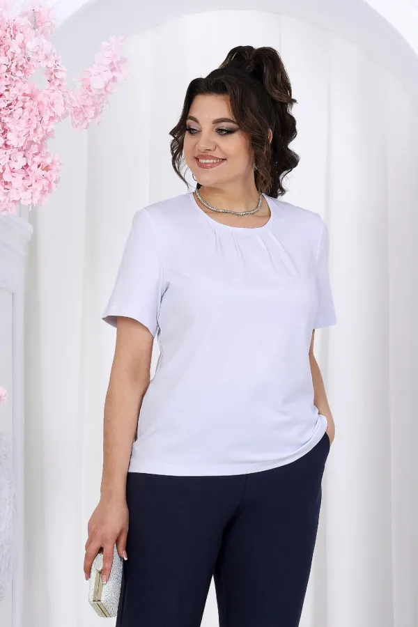 Джемпер полуприлегающего силуэта, выполнен из хлопкового трикотажного полотна. Перед с нагрудными вытачками, выходящими из пройм. От горловины вниз застрочены 4 складки. Горловина переда и спинки округлой формы, по переду углубленная. Срезы горловин окантованы косой бейкой. Рукав втачной, короткий. Длина джемпера -60 см (46-50 р-р), 65 см (52-60 р-р), 67 см (62-66 р-р). Длина рукава – 24,5 см (46-50 р-р), 25,5 см (52-60 р-р), 26,5 (62-66 р-р).