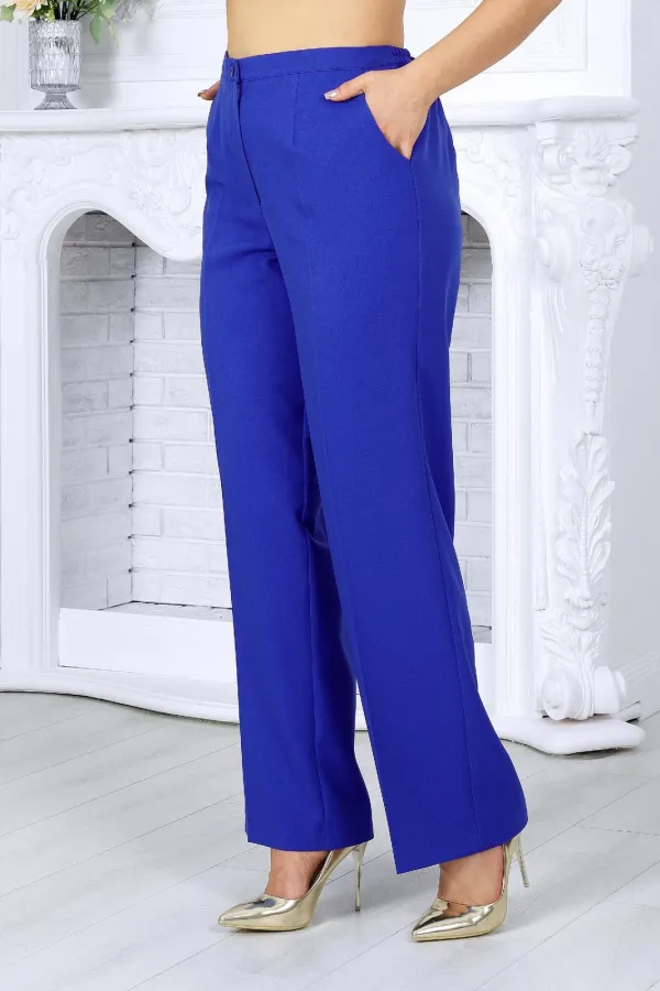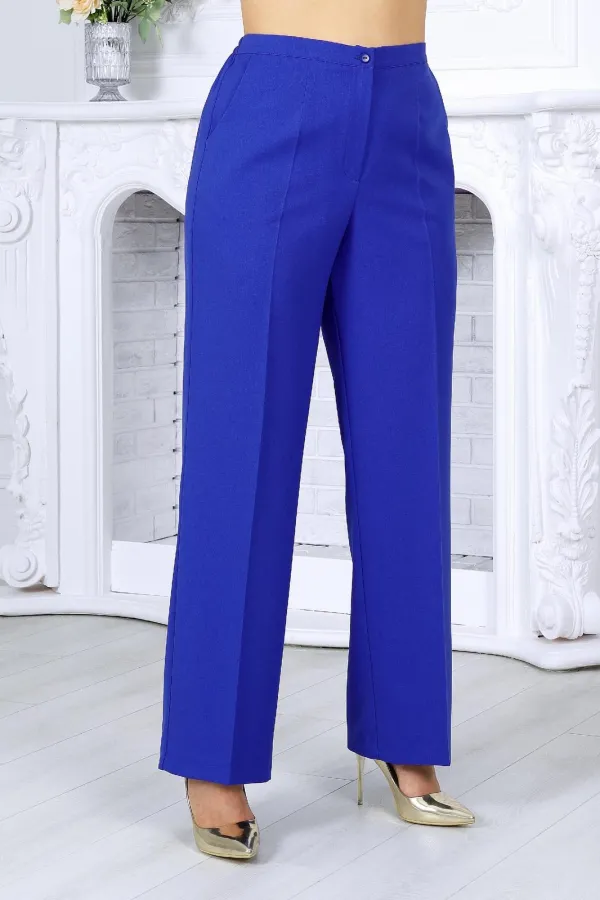 Брюки классические, с кантами и посадкой на талии, выполнены из костюмной поливискозы. Модель с центральной застёжкой на тесьму-«молнию», на притачном поясе, застегивающемся на петлю и пуговицу. Передние и задние половинки брюк с талиевыми вытачками, направленными от пояса вниз. Спереди обработаны боковые наклонные карманы. Для лучшего прилегания брюк в области талии в поясе по задним половинкам вставлена эластичная лента. Длина брюк по боковому (с поясом)-107.