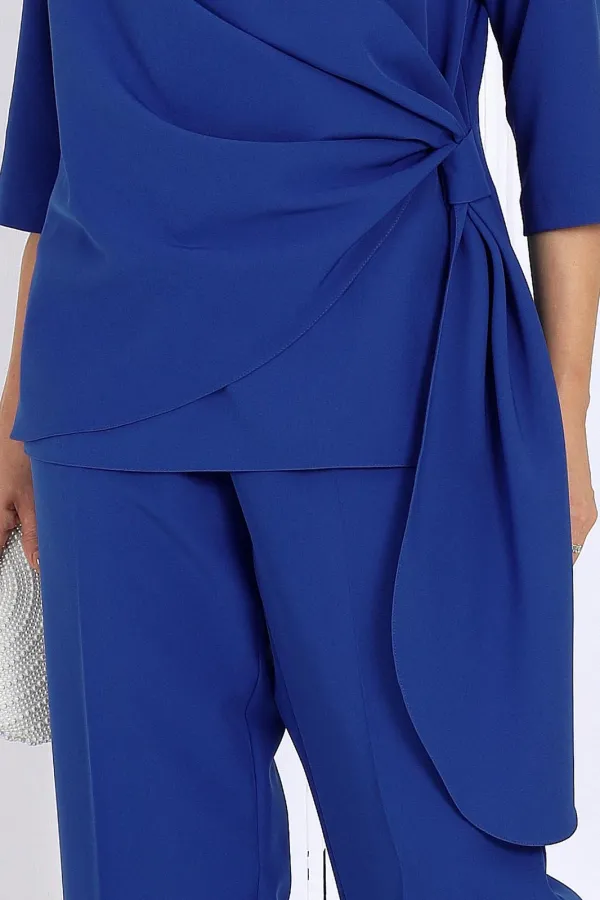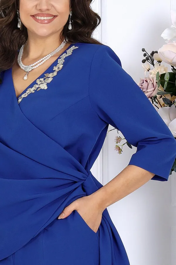 Брючный костюм — идеальный выбор для торжества. Элегантная вечерняя блузка на запах и брюки со стрелками создают утончённый силуэт и визуально стройнят. Модель выполнена из качественной костюмной ткани, украшена кружевом в области декольте.