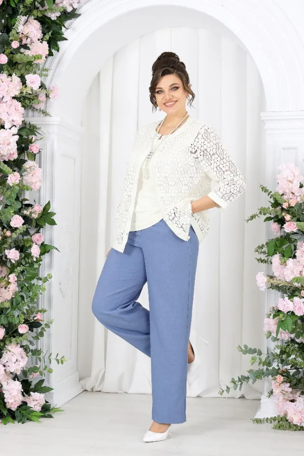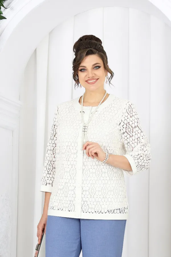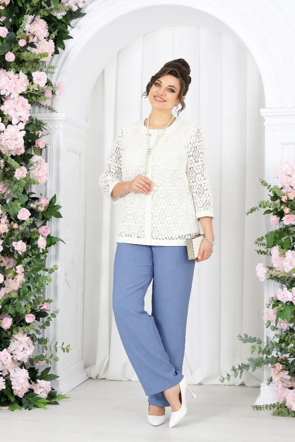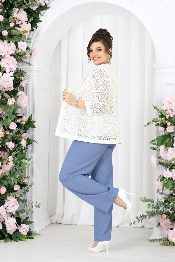 Кружевной жакет добавляет образу изысканности и глубины, словно тонкая работа мастера. Полупрозрачная фактура мягко играет на свету, подчеркивая деликатность и статус. Под ним — лаконичный джемпер из вискозного трикотажа, который дарит комфорт и ощущение уюта в течение всего дня.