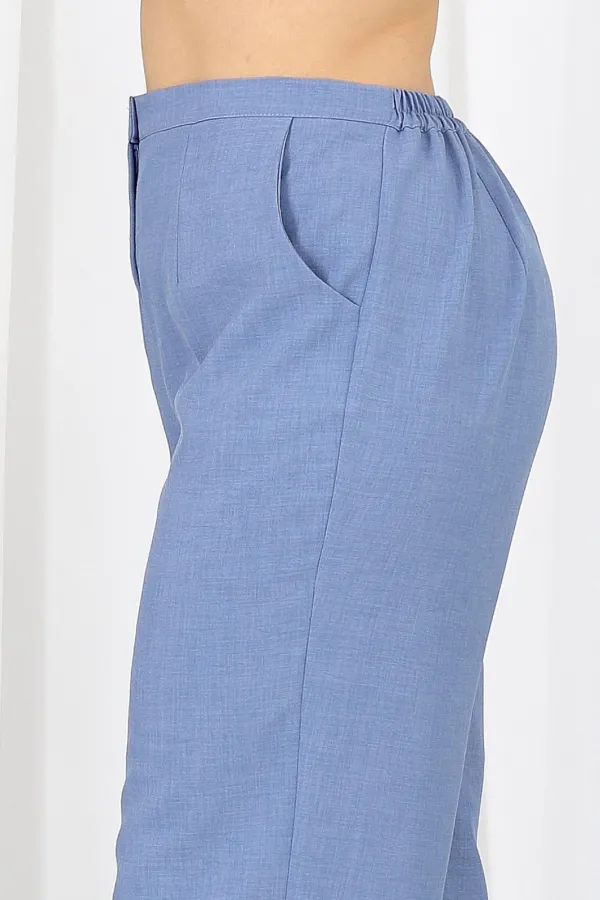 Брюки классические, с посадкой на талии, выполнены из ткани «лен-вишер». Модель без стрелок, с центральной застёжкой на тесьму-«молнию», на притачном поясе, застегивающемся на петлю и пуговицу. Задние половинки брюк с талиевыми вытачками, направленными от пояса вниз. По передним половинкам брюк застрочены складки-«защипы» по центру. Спереди обработаны боковые наклонные карманы. Для лучшего прилегания брюк в области талии в поясе по задним половинкам вставлена эластичная лента. Длина брюк по боковому (с поясом) – 107 см (50-58).