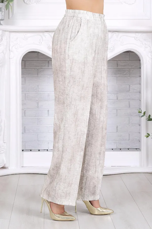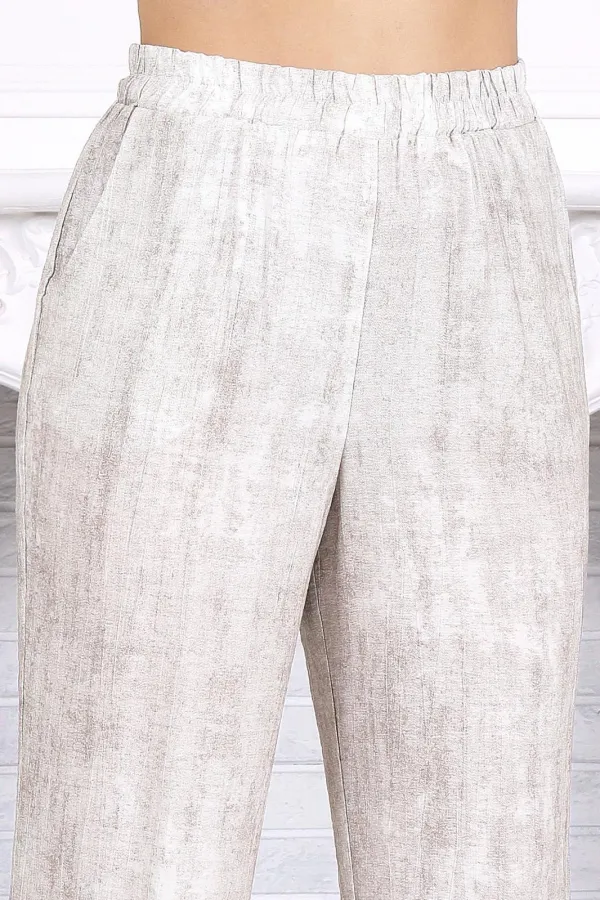 Брюки длинные, прямого силуэта, с посадкой на талии, выполнены из вискозного полотна. Модель без стрелок, без застежки, с наклонными боковыми карманами, на притачном поясе с эластичной лентой внутри. Спереди обработаны наклонные боковые карманы. Длина брюк по боковому (с поясом) – 107 см (50-58 р-р).