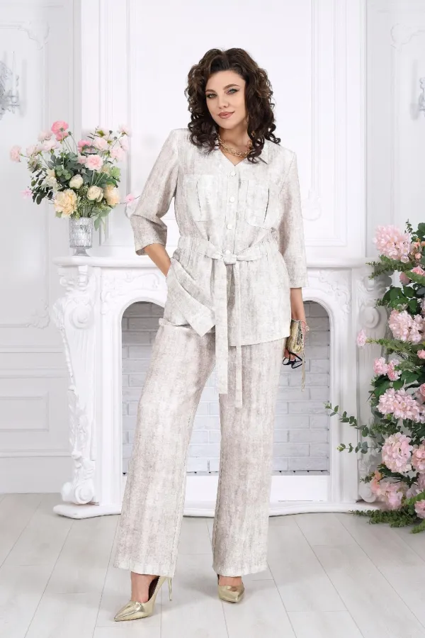 Брюки завершают комплект — прямые, струящиеся, они визуально вытягивают силуэт и дарят ощущение свободы в каждом шаге.