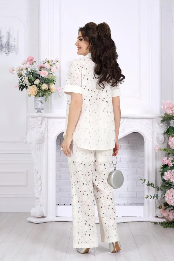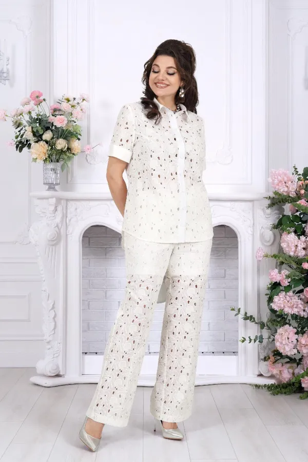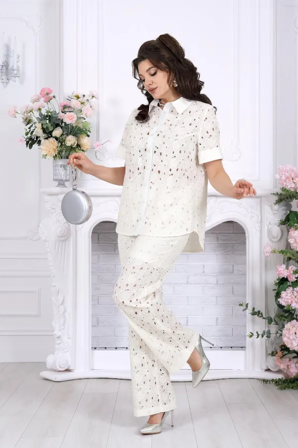 Этот праздничный брючный костюм — про элегантность без усилий. Он словно создан для особых моментов: торжеств, вечеров, встреч, где важно выглядеть безупречно и чувствовать себя уверенно. Ажурное хлопковое кружево ришелье придаёт образу утончённость, лёгкость и благородную нарядность.