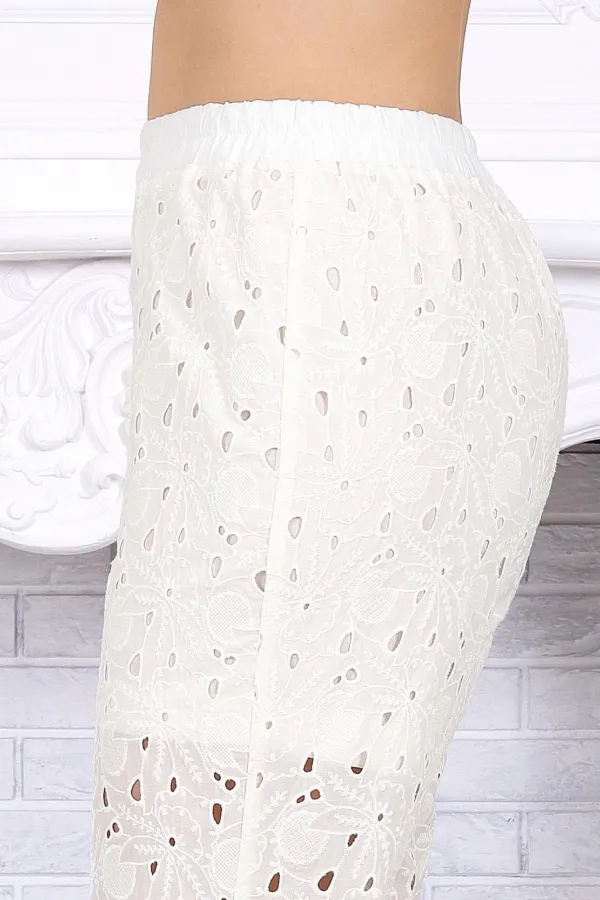 Брюки длинные, прямого силуэта, с посадкой на талии, выполнены из хлопкового ришелье на хлопковой подкладке до линии колен. Модель без стрелок, без застежки, с наклонными боковыми карманами, на притачном поясе с широкой эластичной лентой внутри. Длина брюк по боковому шву (с поясом) – 107 см (50-58 р-р).
