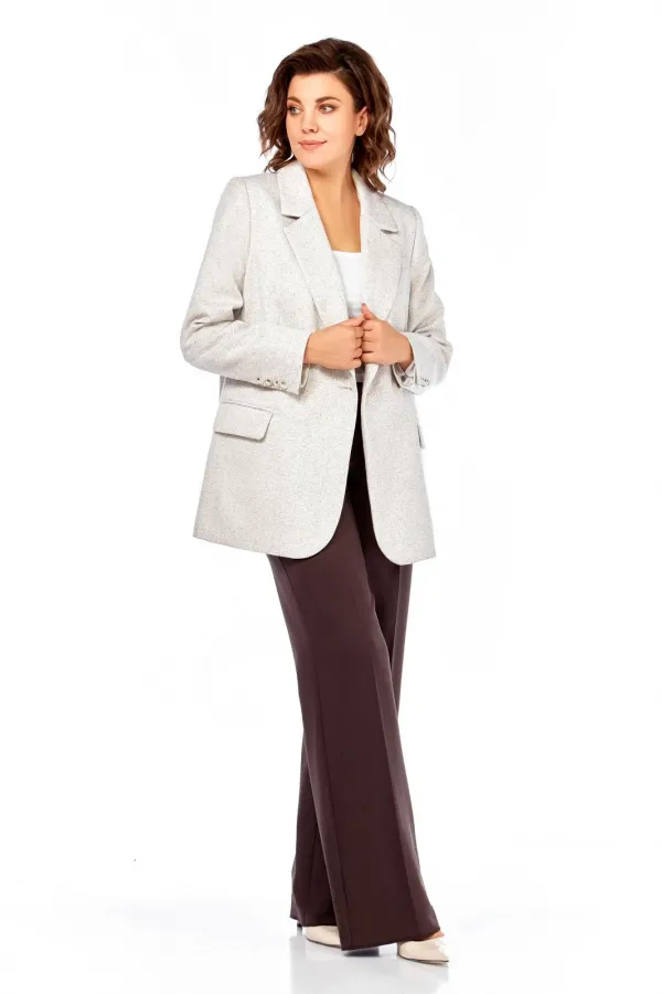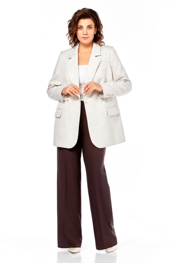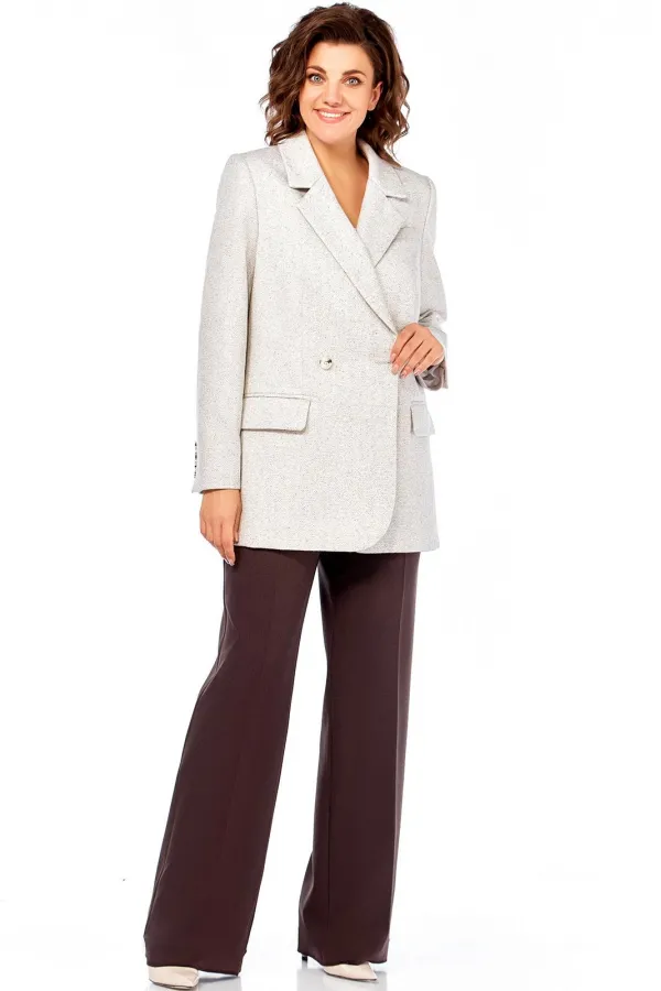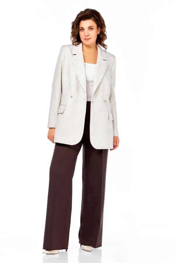 Стильный костюм, из сочетания двух видов ткани. Жакет из мягкой плотной костюмной ткани, прямого силуэта. Пиджачный воротник, двубортная застежка, карнамы с клапанами. Слева вверху декоративная листочка. По спинке шлица. Рукава втачные, внизу шлицы и пуговицы. Брюки прямые, пояс по спинке на резинке, карманы в боковых швах. Заутюжены стрелки.