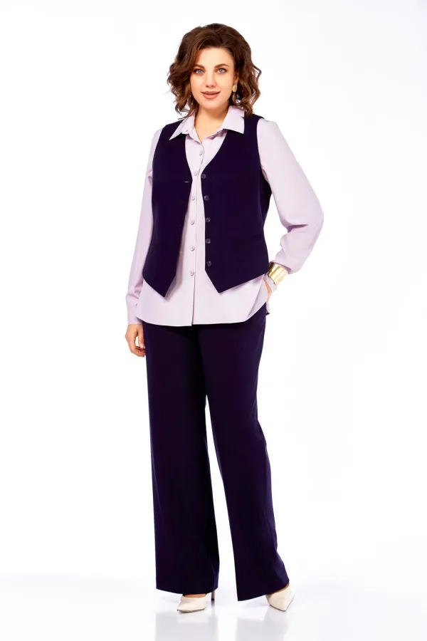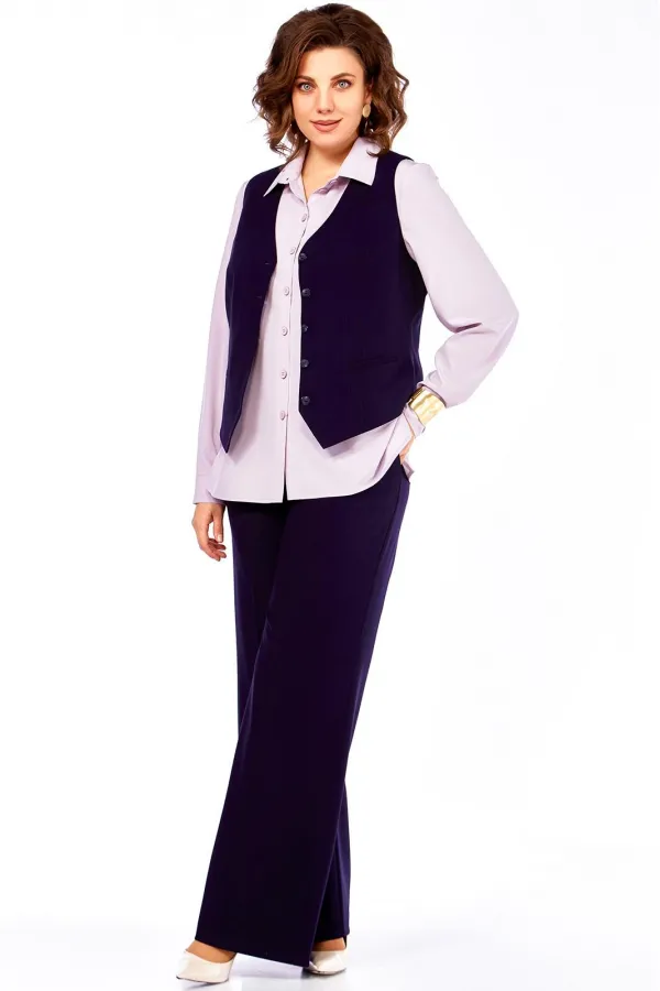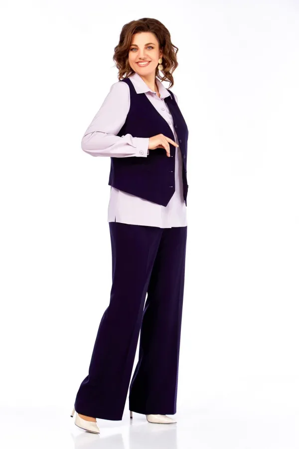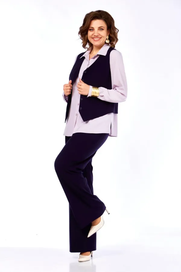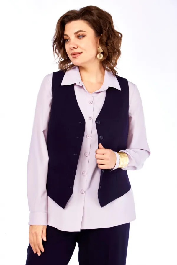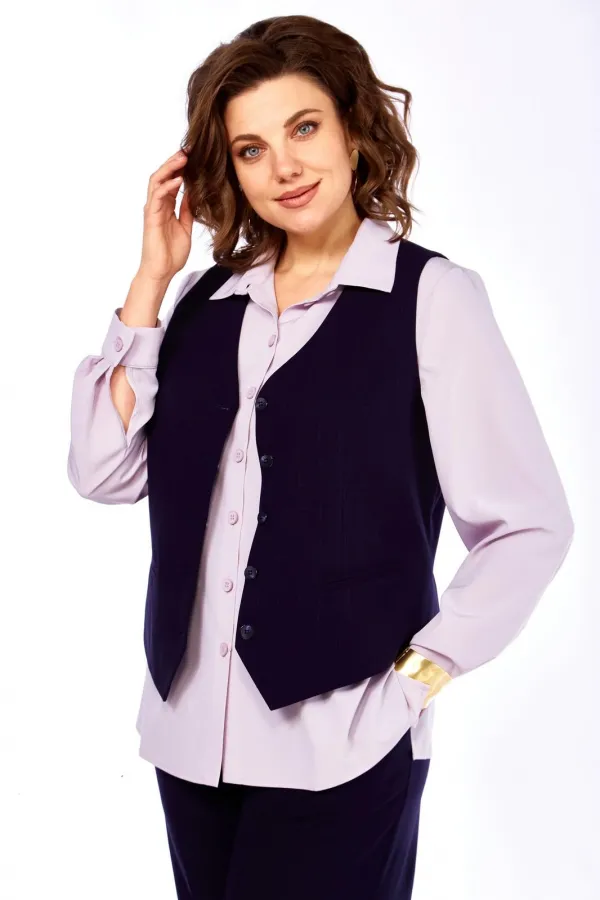Комплект женский, состоит из блузки, жилета и брюк. Полуприлегающий силуэт, жилет с V-образной формой горловины, на переде рельефы от проймы, имитация карманов с клапаном, по спинке хлястик с пуговицей. Блузка с рубашечн... Читать далее...