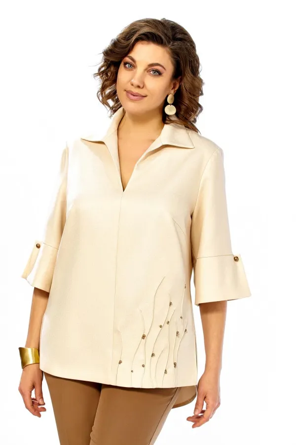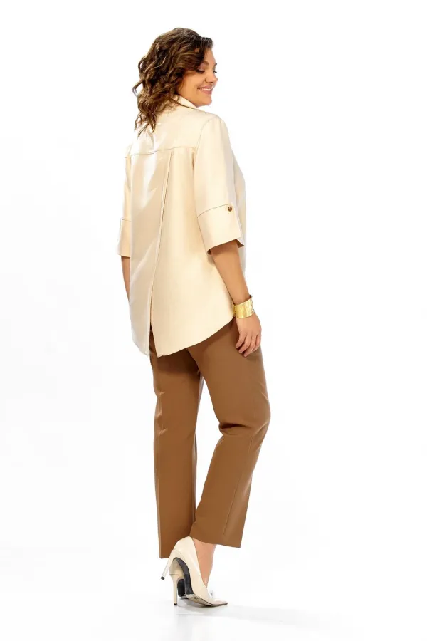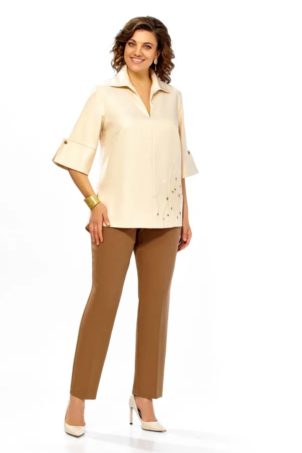 Комплект женский, состоит из блузы и брюк. Блузка из ткани с блеском. А брюки однотон. На блузе по центру шов, вырез горловины V-oбразной формы, с отложным воротником. По низу справа декоративный элемент в виде защипов и бусин пришивных. По спинке отрезная кокетка, от кокетки вниз детали на запах. Низ фигурной формы. Рукав ниже линии локтя, с притачной манжетой и отделочными пугавицами. Брюки слегка зауженные к низу со стрелками. Брюки на поясе, с застежкой на молнию, по спинке резинка.