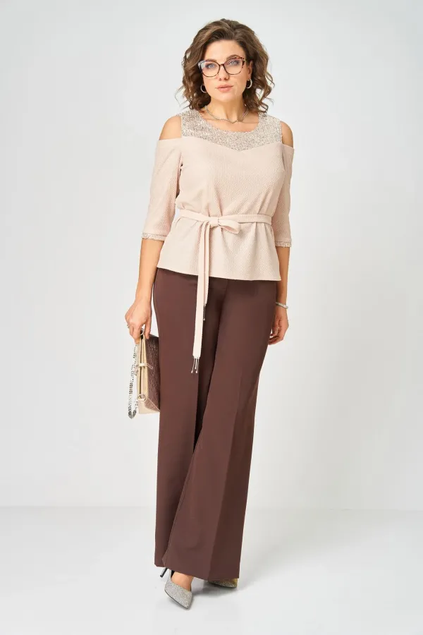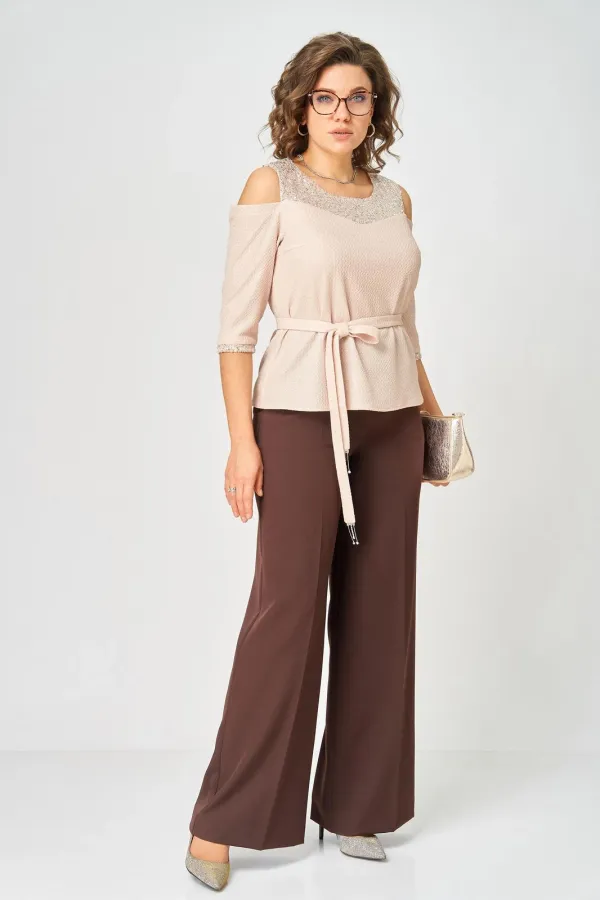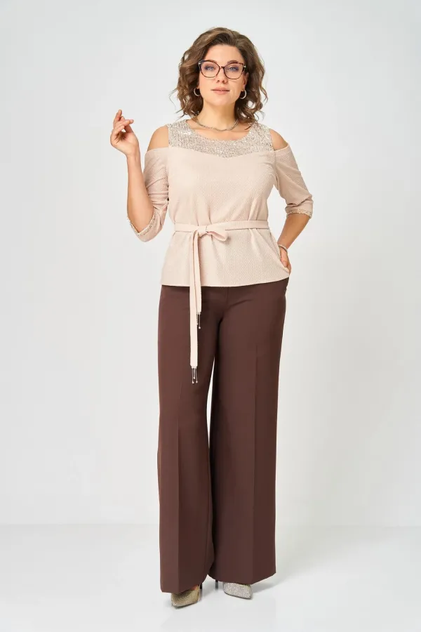 Комплект женский, состоящий из блузы трикотажного полотна с блеском и отделкой пайетки и брюк из костюмной ткани.