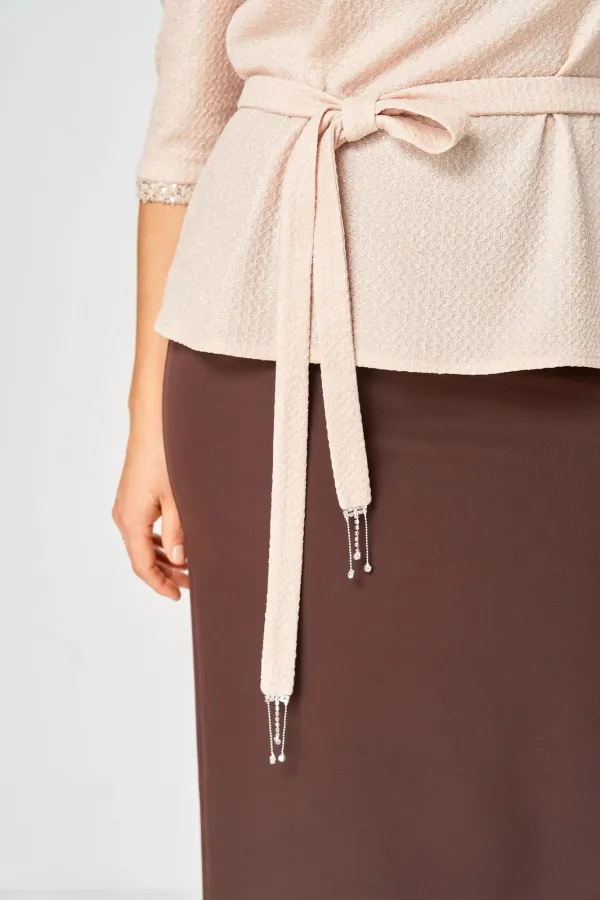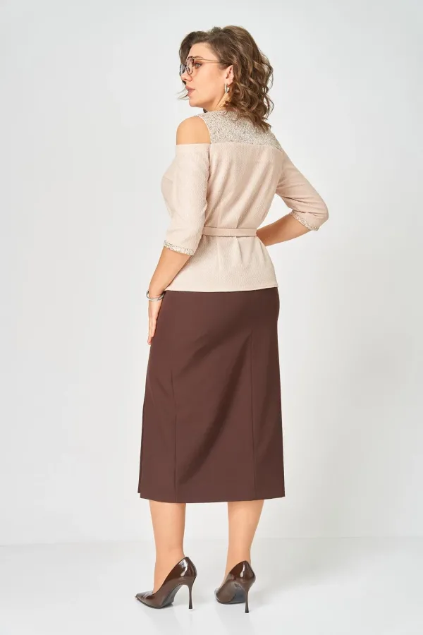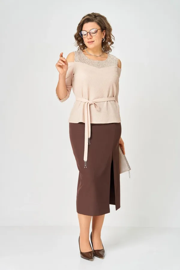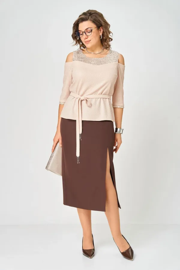 Комплект женский, состоящий из блузы трикотажного полотна с блеском и отделкой пайетки и юбки из костюмной ткани.