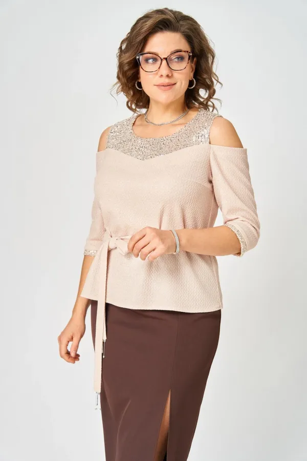 Блуза полуприлегающего силуэта. По переду и спинке кокетки из отделочной ткани (пайетки) на трикотажной подкладке. По переду нагрудная вытачка, идущая из боковых швов, по спинке талиевые вытачки. Рукав втачной, без верхней части, длиной чуть ниже локтя, снизу бейка из отделочной ткани (пайетки).