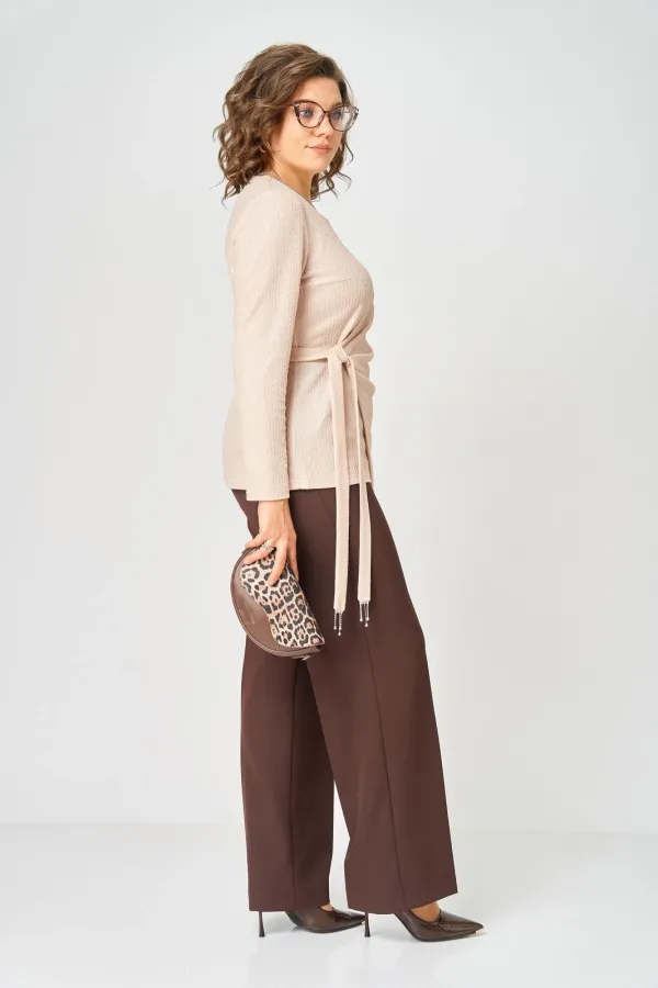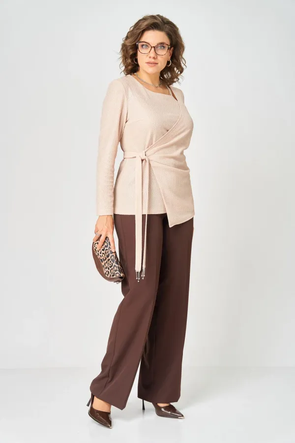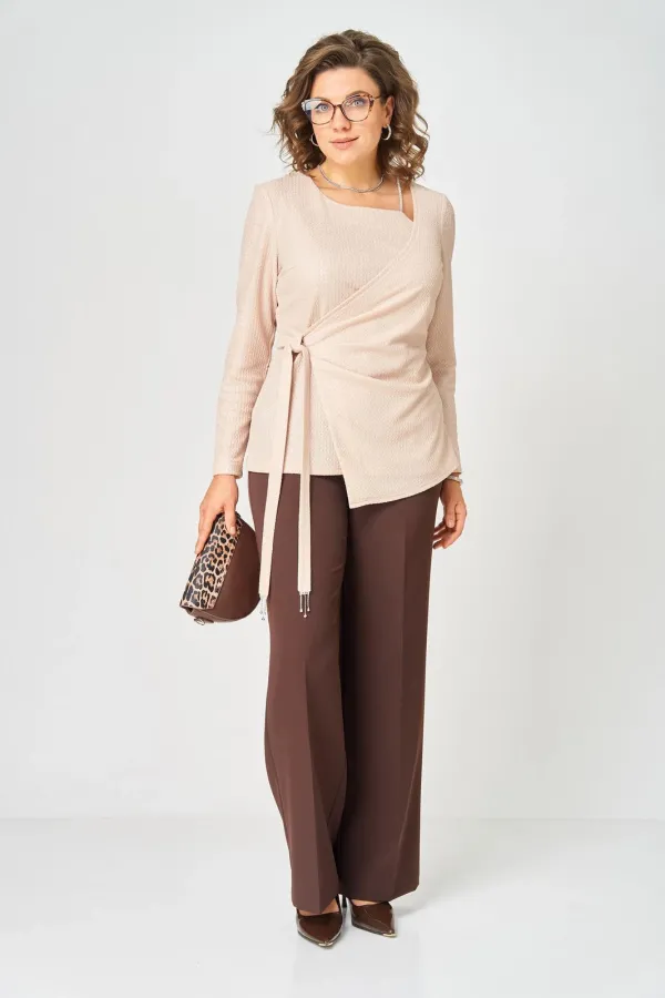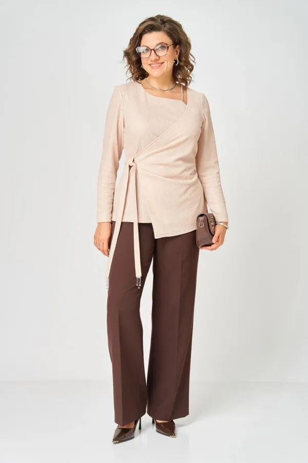 Комплект женский, состоящий из блузы трикотажного полотна с блеском и брюк из костюмной ткани. Блуза полуприлегающего силуэта. По переду отлетная деталь, идущая с левого плечевого шва, со складками в области талии и завя... Читать далее...