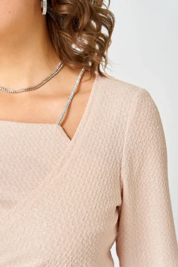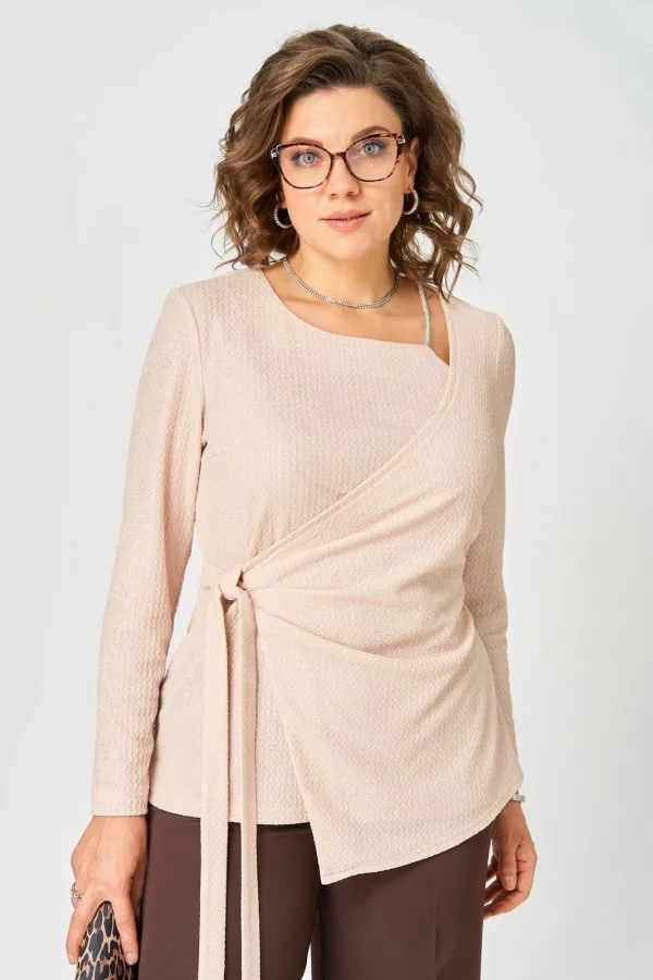 Блуза полуприлегающего силуэта. По переду отлетная деталь, идущая с левого плечевого шва, со складками в области талии и завязывающаяся на пояс, к концам которого пришита отделочная тесьма (стразы). По переду вырез ассиметричный, украшен декоративной тесьмой. На нижней части переда нагрудные вытачки, идущие из боковых швов. Рукав втачной, длинный.