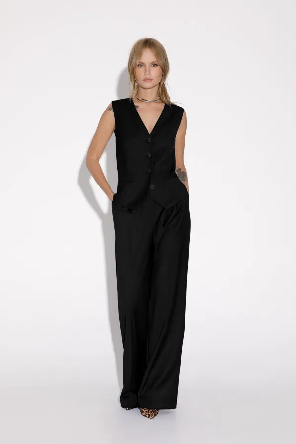 Текстильный костюм-тройка из свободного жакета со шлицами, жилета и прямых брюк-палаццо Детали: жакет полуприлегающего силуэта, талиевые вытачки, пиджачный воротник, застежка на две петли и пуговицы, функциональные карманы, рукава и спинка со шлицами, жакет на подкладке из 100% вискозы. Жилет полуприлегающего силуэта с фигурным низом, застежка на петли и пуговицы, на подкладке из 100% вискозы. Брюки с высокой посадкой на притачном поясе со шлевками, застежка на молнию и пуговицу, боковые карманы, передние половины с заутюженными стрелками и двумя небольшими складками