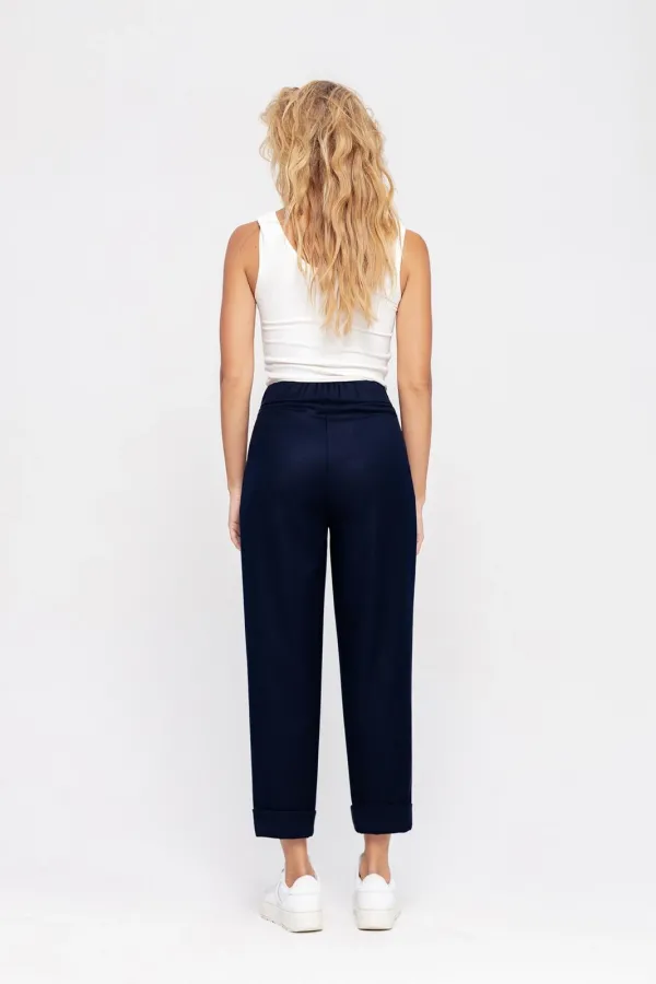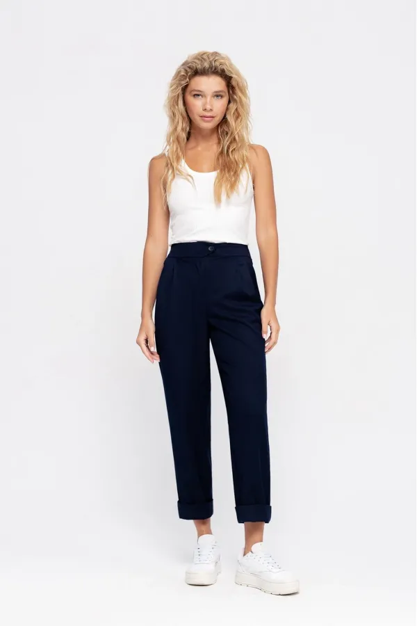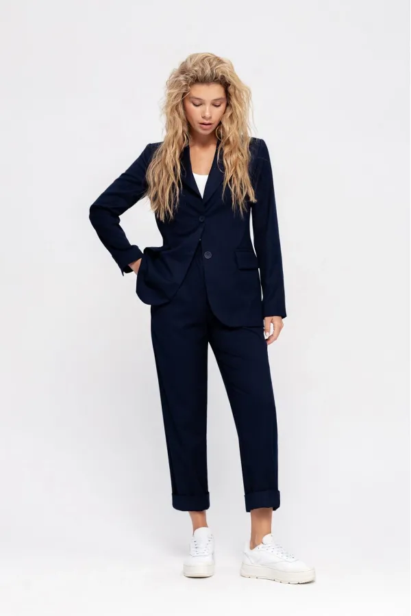 Текстильный костюм-двойка из свободного жакета со шлицами и брюк со складками Детали: жакет полуприлегающего силуэта, талиевые вытачки, пиджачный воротник, застежка на две петли и пуговицы, функциональные карманы, рукава и спинка со шлицами, жакет на подкладке из 100% вискозы. Брюки с высокой посадкой, притачной пояс со шлевками, задняя часть пояса эластичная- с резинкой, застежка на молнию и пуговицу, боковые карманы, передние половины с двумя складками
