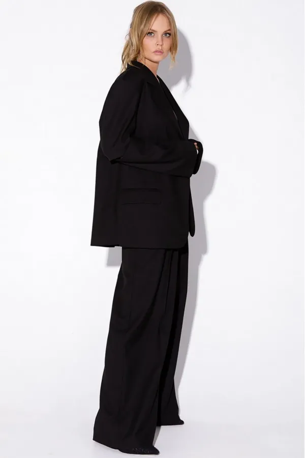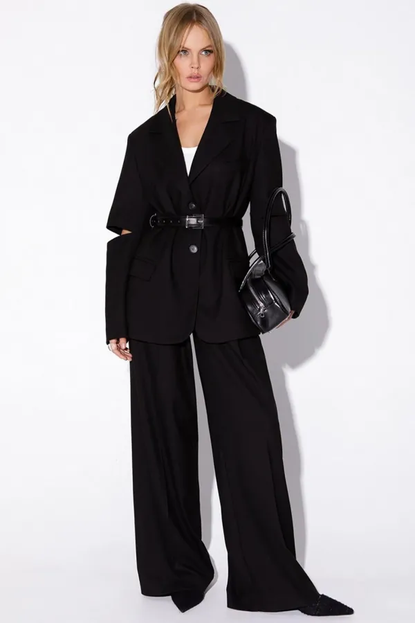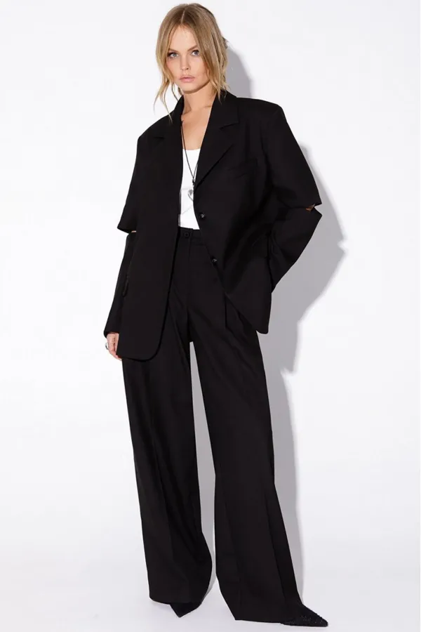 Текстильный костюм-двойка из оверсайз жакета с разрезами по рукавам и широких брюк-палаццо.