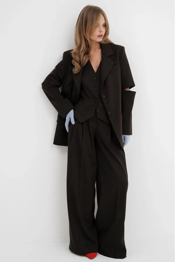 Текстильный костюм-двойка из оверсайз жакета с разрезами по рукавам и широких брюк-палаццо.