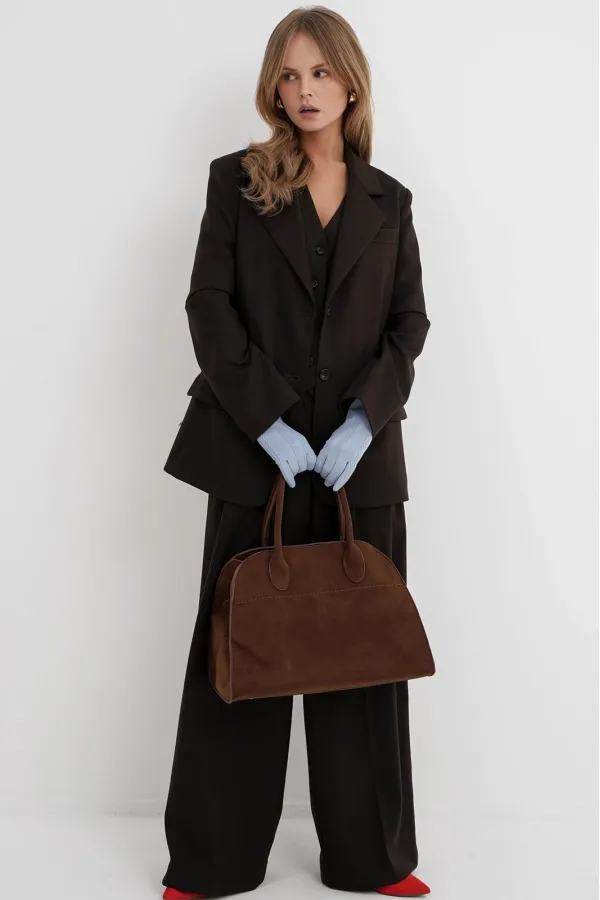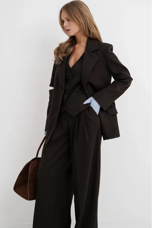 Текстильный костюм-тройка из оверсайз жакета с разрезами по рукавам, полуприлегающего жилета и широких брюк-палаццо. Детали: жакет свободного покроя, прямой силуэт, застежка на петли и пуговицы, функциональные карманы, жакет на подкладке. Жилет полуприлегающего силуэта, талиевые вытачками, застежка на петли и пуговицы, функциональные карманы, фигурный низ, на подкладке. Брюки с притачным поясом со шлевками, перед со складками и заутюженными стрелками, застежка на молнию и пуговицу, боковые карманы. Задние части брюк с вытачками и имитацией карманов. Длина жакета по спинке около 71 см в размерах 40-48 и около 73 см в размерах 50-52, длина рукава около 61 см. Длина жилета по спинке около 48,5 см в размерах 40-46 и около 51,5 см в размерах 48-52. Длина брюк по боковому шву с поясом около 109,5 см, длина по внутреннему шву около 83 см.