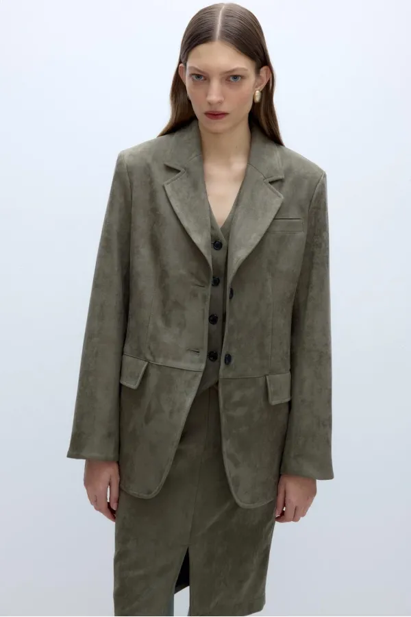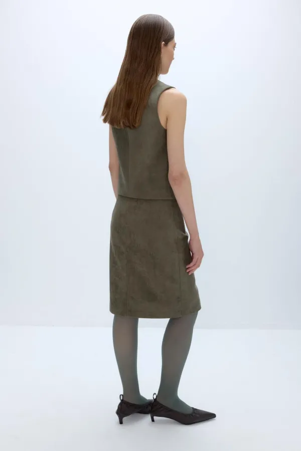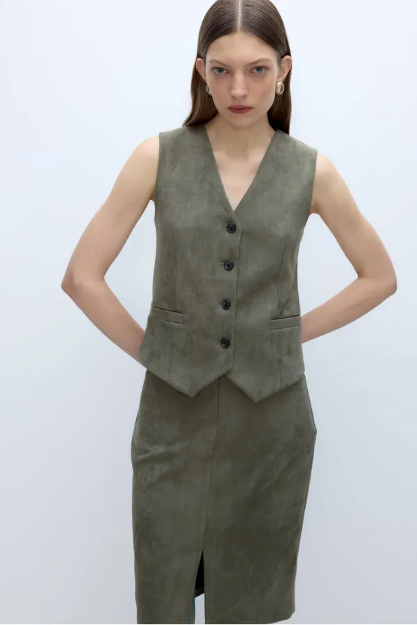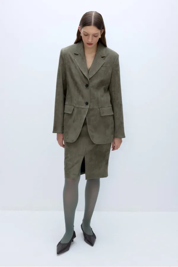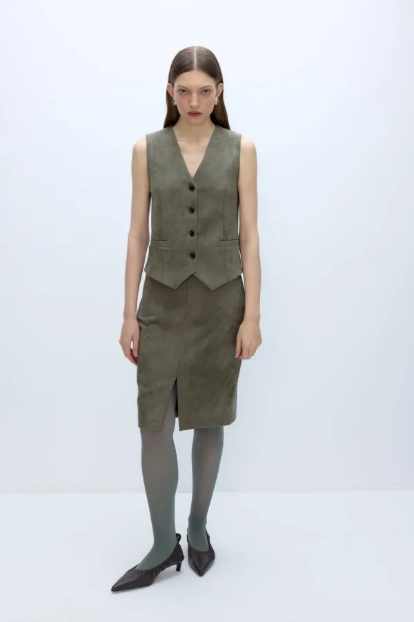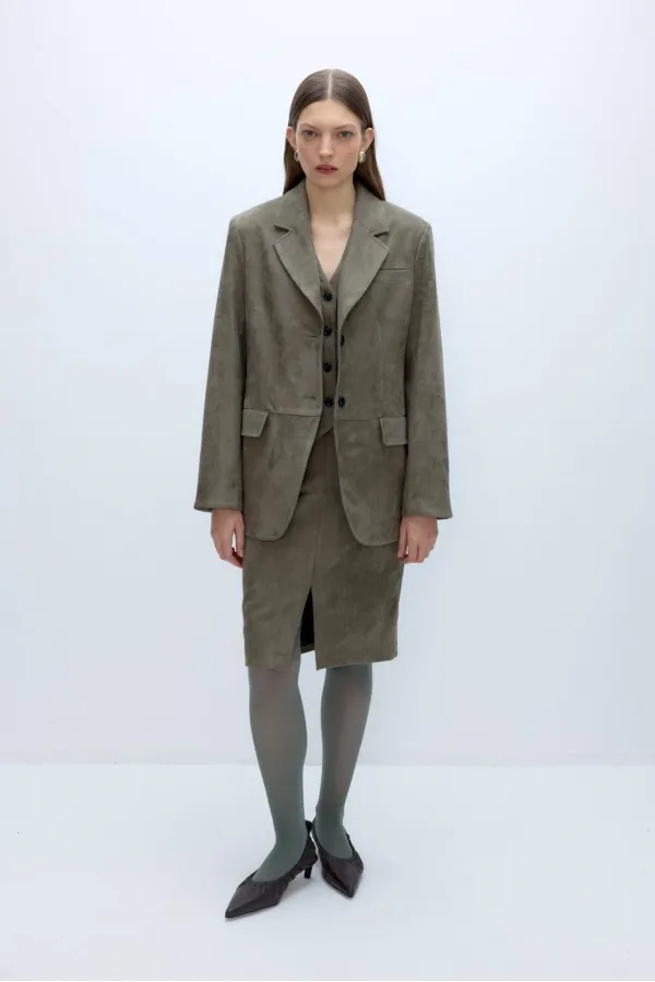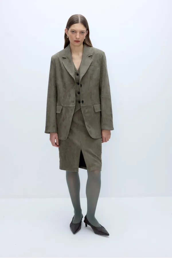 Костюм-тройка из свободного жакета, полуприлегающего жилета и юбки-карандаш с высоким разрезом из экозамши.