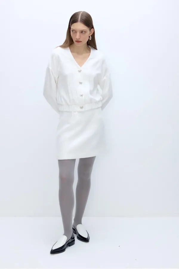 Костюм-двойка из укороченного бомбера и мини-юбки из велюровой ткани в пайетки.