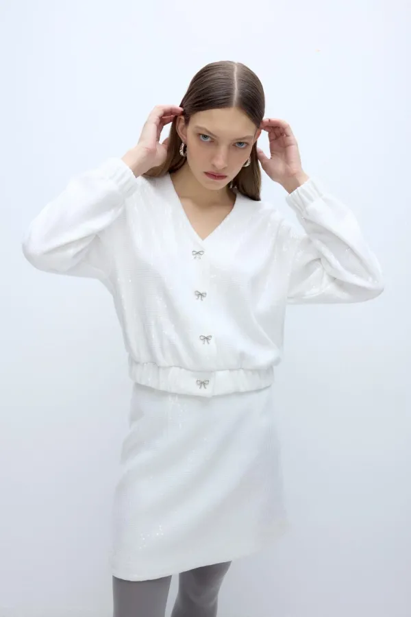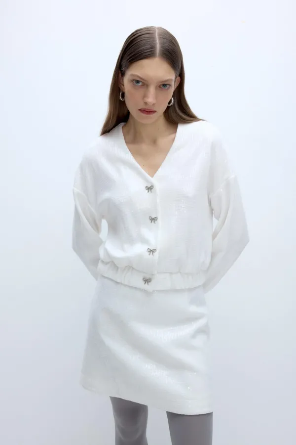 Костюм-двойка из укороченного бомбера и мини-юбки из велюровой ткани в пайетки.Детали: спущенная линия плеча, V-образный вырез горловины переда, застежка на пришивные кнопки и декор в виде бантиков, рукава и низ бомбера ... Читать далее...